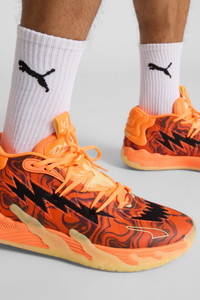 PRODUCT STORY Run like an intergalactic MVP in the MB.03 Halloween. NITRO™ foam rockets energy return with each explosive step, while the space-age woven upper lets breathability blast off. Scratch cutouts and slime soles complete the Melo world trip. Get ready for lift-off. FEATURES & BENEFITS - NITRO™: Advanced nitrogen-injected foam designed to provide superior responsiveness and cushioning in a lightweight package - PUMAGRIP: Durable performance rubber compound designed for all-surface traction DETAILS - Style: 311176_01 - Color: Fluro Orange Pes-PUMA Black - Regular fit - Engineered woven mesh upper material for breathable feel and support - TPU heel counter adds lateral stability - Laces wrap through LaMelo's winged logo on tongue - "RARE" AND "1of1" callouts on the pull-tab - Glow in the Dark details - PUMA branding details MATERIAL INFORMATION - Midsole: 100% Synthetic - Sockliner: 100% Textile - Outsole: 98.30% Rubber, 1.70% Synthetic - Upper: 69.50% Textile, 30.50% Synthetic - Lining: 100% Textile
