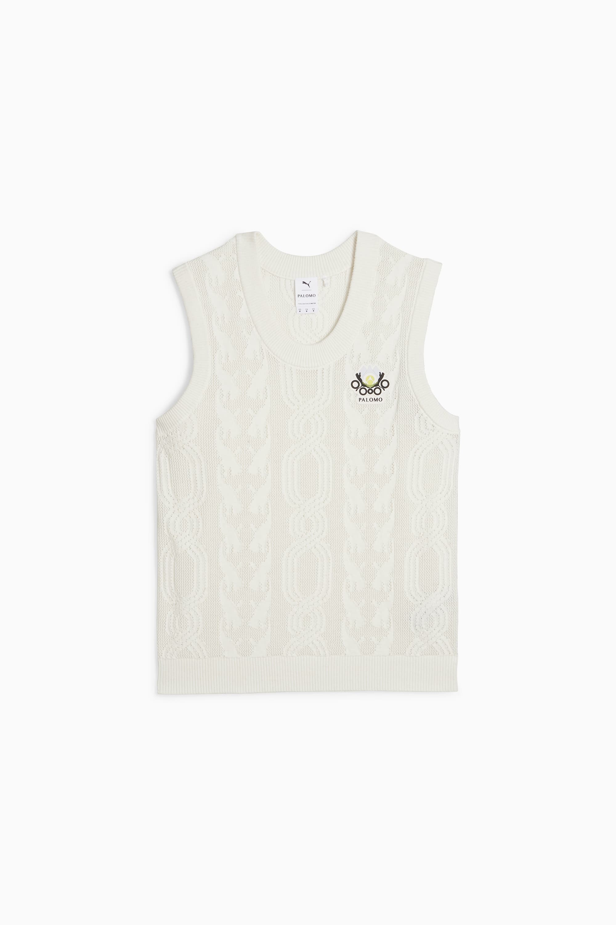 PRODUCT STORY Founded in 2015, Palomo Spain is known for designs that combine the dramatic spirit of southern Spain with the sophisticated street style of London. The latest PUMA x PALOMO SPAIN collab draws inspiration from the early ‘80s roller skate scene, as you can see with this top, with its optimistic colors and bold patterns. DETAILS - Style: 625559_65 - Color: Warm White - Relaxed fit - sweater - Crew Neck - Sleeveless - Regular length MATERIAL INFORMATION - SHELL: 70% cotton, 30% wool - BOTTOM HEM: 67% cotton, 30% wool, 3% other fibres - RIB: 70% cotton, 30% wool