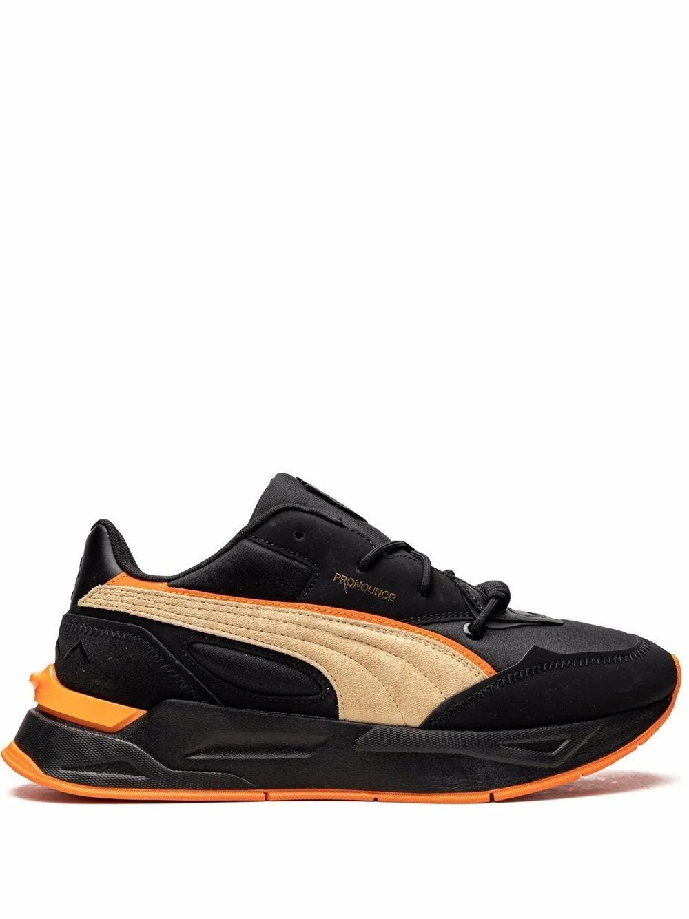 Mirage Sport Pronounce sneakers PUMA and PRONOUNCE have created a collaboration in an earthy palette inspired by Pumapunku, an ancient archaeological site in Bolivia. The pair uses a very textural material mix in a neutral colour scheme, acccents of bright orange while rope detailing add a bold touch. Highlights - Black/orange - Rubber - Side stripe detailing - Round toe - Front lace-up fastening - Logo patch at the tongue - Branded insole - Rubber sole - These styles are supplied by a premium sneaker marketplace. stocking only the most sought-after footwear, they source and curate some of the most hard to find sneakers from around the world. Imported Composition Outer: Polyester 100% Sole: Rubber 100% Lining: Fabric 100%