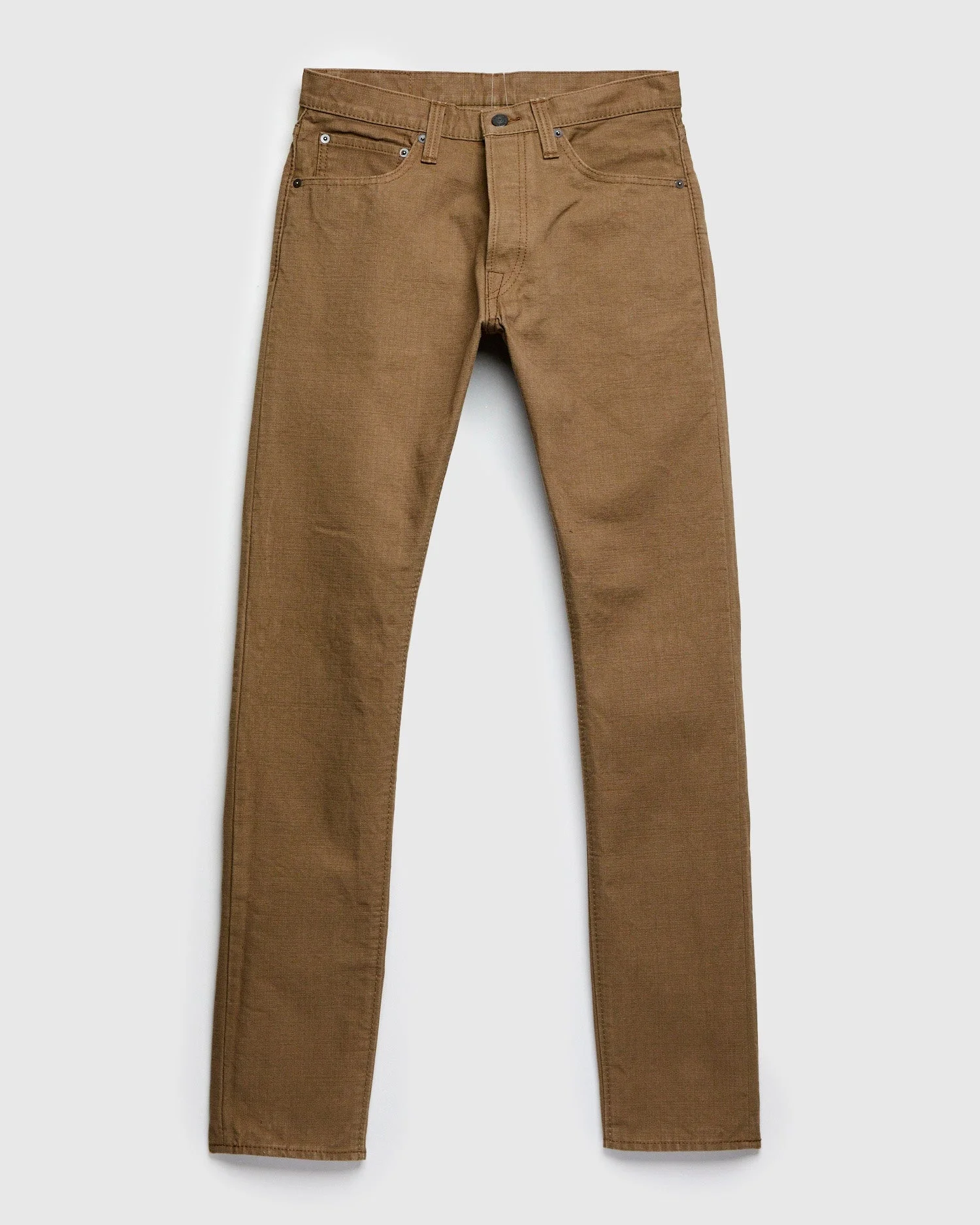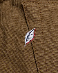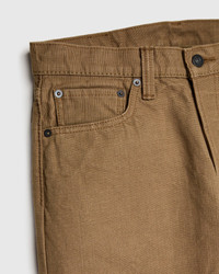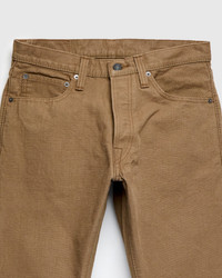 Presented in a classic 5-pocket silhouette, Pure Blue Japan's 1175 Pant features a custom woven khaki-beige 13.5oz duck canvas fabric. Pure Blue Japan's heavyweight Duck Canvas fabric features a robust heft and rough-handed texture; complete with a faux selvedge ID on the interior. As with other styles in PBJ's catalog, the 1175 fabric is woven on an old-world shuttle loom using a specialized slow weaving technique to produce the unique texture the brand is renowned for. Finished with custom nickel buttons, a deerskin leather patch, and Pure Blue Japan indigofera leaf embroidery. - Heavyweight duck canvas fabric, rinsed to remove shrinkage - Khaki beige warp and weft - The "Relaxed Tapered" fit from Pure Blue Japan is designed with additional room in the top block and thighs and a strong taper from the knee down - Signature Pure Blue Japan leaf embroidery on back right pocket - Deerskin leather patch - Faux blue selvedge ID - Custom branded nickel button fly - Hidden back pocket copper rivets - Raised belt loops - Chain stitched hems - 100% cotton - Made in Japan