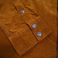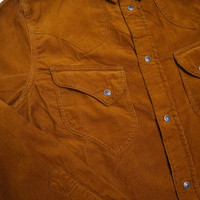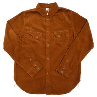 This western shirt from Pure Blue Japan is sewn from an extremely soft and supple 100% cotton Japanese corduroy, woven with premium long-staple cotton yarns to provide durability and softness, while also allowing for the fabric to be woven into a finer wale corudoroy, which is perfect for layering underneath outerwear. The western details themselves pair very well with the fine wale cord, and are quite unique, setting this apart from your usual western snap shirts. The pockets and yokes on this piece feature very intricate curved details, offering a much softer, rounder, and more unique take on the classic western shirt. Available in camel or navy. - 100% cotton - Japanese fine wale corduroy - Curved western yokes and pockets - Charcoal snap buttons and branded throat snap - Made in Japan Size up from your usual size; we think most guys will size up twice in this piece