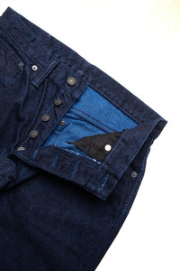 - Color: Indigo x Blue - 14oz PBJ Original Slubby Japanese Selvedge Denim - Relaxed tapered fit - 100% Cotton - Navy Leaf Version - Blue In Green Original Sheepskin Black Leather Patch - 100% Cotton Thread Sewing Construction - One Wash - Black Herringbone Twill Pocket Lining - Made In Japan Note: Customers typically go up 1 to 2 sizes. Also available in Denver
