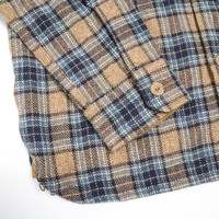 Perhaps the best flannels we have ever received from Pure Blue Japan; these 100% cotton tweed brushed flannel shirts are seriously outstanding, in terms of both fabric and style. This flannel is woven with triple-twisted yarns, made from incorporating three different colours and twisting them together, which gives fabrics like this one unmatched depths of colour and pattern - the fabric is striking from a distance, and the closer you look, the more beautiful the colours and the more intricate the pattern becomes. Thanks to the combination of the twisted yarns and brushed fabric, this flannel is incredibly soft and plush, almost like a very soft but thick wool. Finished with two asymmetrical chest pockets, self-fabric buttons, and chainstitch construction and runoff. Available in three different patterns. - 100% cotton - Japanese twisted yarn cotton tweed - Two asymmetrical chest pockets - Self-fabric buttons (covered in fabric) - Chainstitch construction and runoff - Made in Japan Size up from your usual size; we think most guys will size up twice in this piece