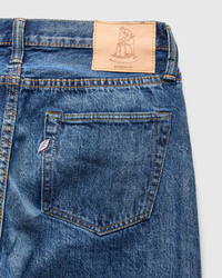 Pure Blue Japan applies a "Used" wash treatment to the brands signature 14oz slub selvedge denim. The wash treatment mimics patina developed through years of intensive wash and wear. Pure Blue Japan's 14oz denim makes use of irregular slub yarns, woven on vintage shuttle looms at low-tension for a deeply textured fabric with a natural charm. Finished with custom hardware, a deerskin natural leather patch, and the signature Pure Blue Japan indigofera leaf embroidery. - 14oz washed Japanese selvedge denim - The Regular Straight (003) fit from Pure Blue Japan has a medium-high rise with a classic straight fit through the leg and a very slight taper at the ankle - Signature Pure Blue Japan leaf embroidery on back pocket - Deerskin natural leather patch - Red selvedge ID - Custom branded nickel button fly - Hidden back pocket copper rivets - Raised belt loops - Chain stitched hems - 100% cotton - Made in Japan