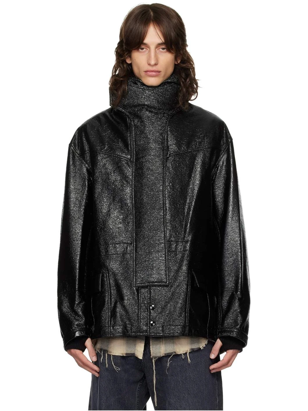 Crinkled coated virgin wool coat. · Paneled construction · Velcro tab at hood · Stand collar · Concealed zip closure and velcro placket · Flap pockets · Concealed drawstring at hem · Inset rib knit cuffs Supplier color: Shiny black