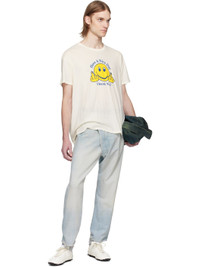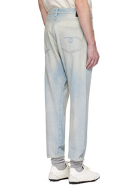 Straight-leg non-stretch denim jeans. Fading, whiskering, and subtle distressing throughout. · Belt loops · Button fastening at asymmetric waistband · Five-pocket styling · Offset button fly · Leather logo patch at back waistband · Logo-engraved antiqued copper-tone hardware · Contrast stitching in yellow Supplier color: Toni blue Body: 100% cotton. Trim: 100% leather. Lining: 65% polyester, 35% cotton. Made in Italy 251021M186023