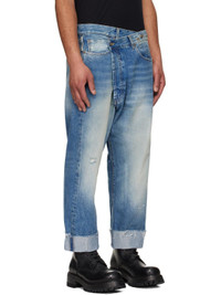 Non-stretch denim jeans. · Fading and whiskering throughout · Straight-leg · Belt loops · Wrap construction at front waistband · Five-pocket styling · Button fly · Distressing at front legs · Paint splatters at pockets and front leg · Raw edge at rolled cuffs · Leather logo patch at back waistband · Dyed graphic at back pocket · Contrast stitching in tan Supplier color: Jasper 100% cotton. Made in Italy 261021M186011