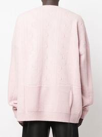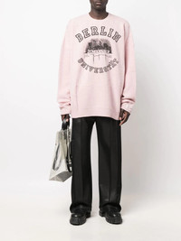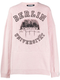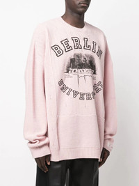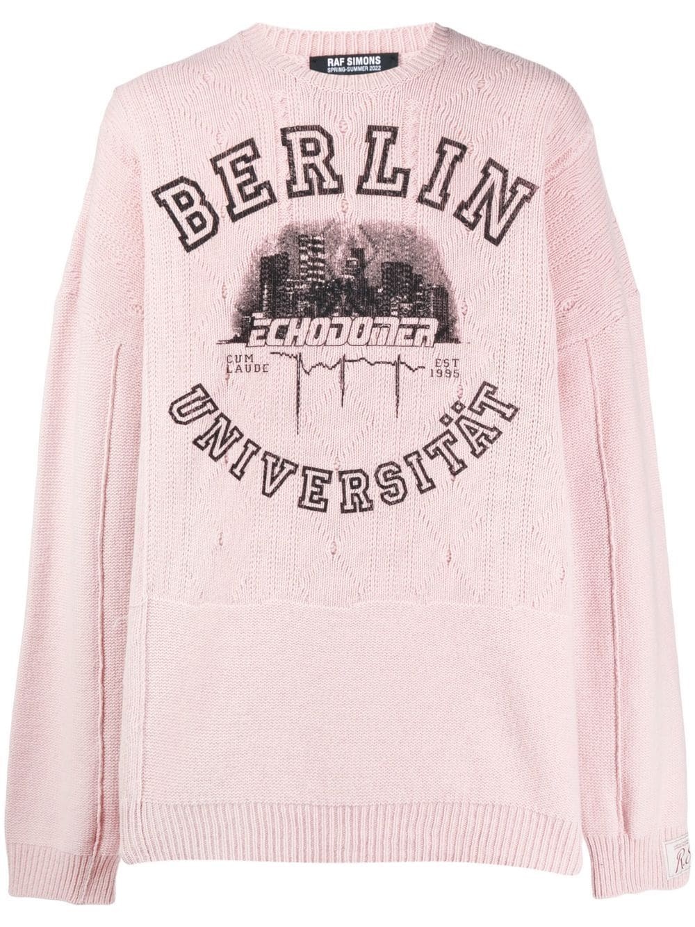 The Echodomer graphic nestled between the Berlin University print on this pale pink pointelle-knit wool sweater was first seen on Raf Simons' SS22 runway. DETAILS - COLOUR: Pink - COMPOSITION: 100% merino wool. - CARE: Dry clean - COUNTRY OF ORIGIN: Italy - Black university print - Contrast panelled construction, ribbed edges
