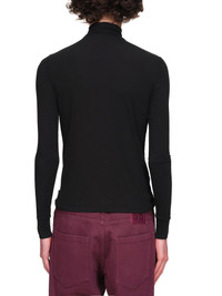 Raf Simons top in black, roll neck collar, fitted silhouette, long sleeves, graphic print on chest. Made in Portugal. Standard Sizing. Composition: 95% Micromodal, 5% Elastane. Model is 6'1" and is wearing a size XS. Shoulders: 18" Chest: 31" Waist: 30"