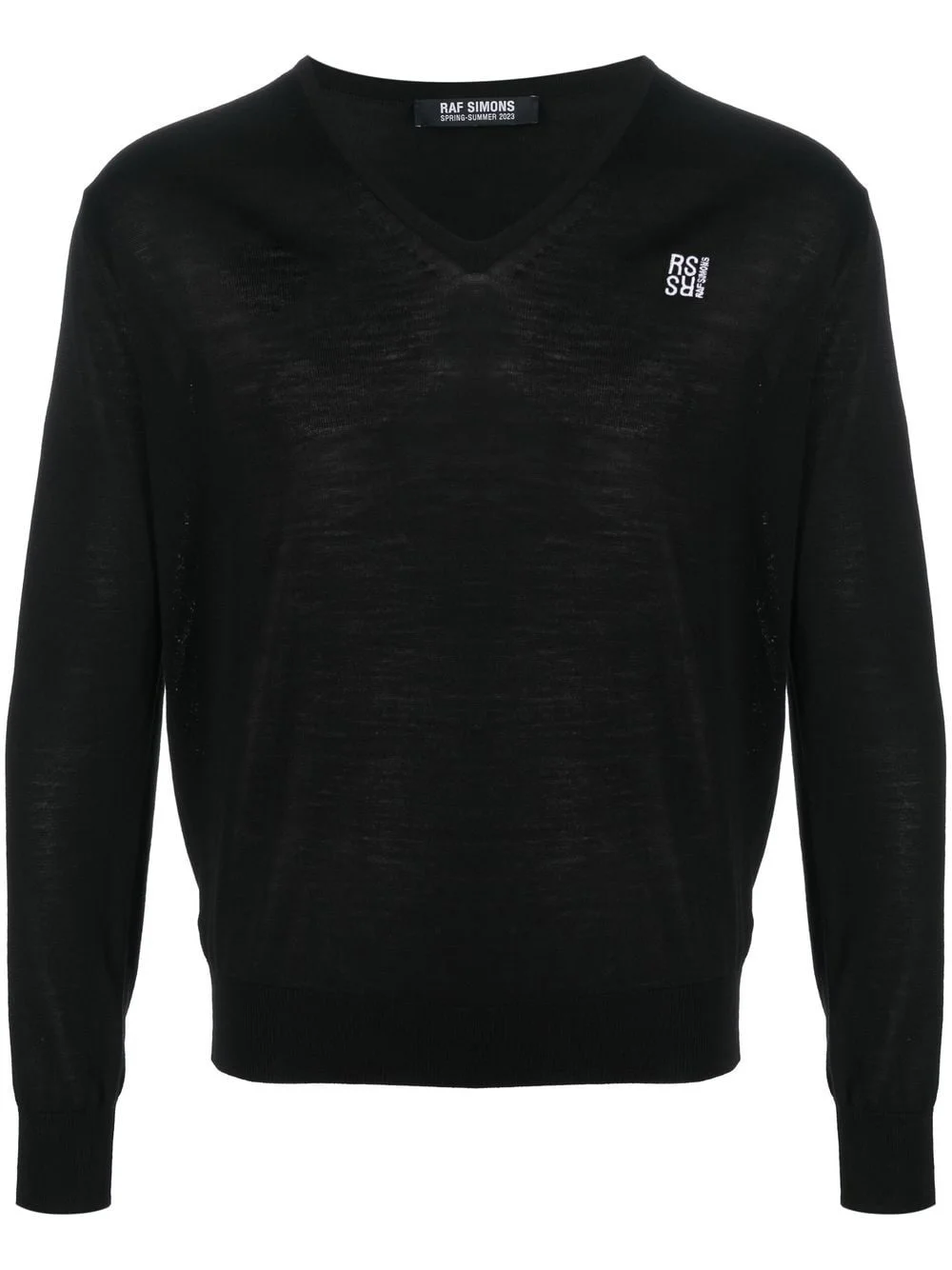 embroidered-logo merino wool jumper Raf Simons nods to youthful ideas with themes of rebellion and playfulness for SS23. Boasting a sleek silhouette, this black merino wool jumper is characterised by the contrast logo embroidery that adorns its left chest. Made in Italy Composition Merino 100% SIZE & FIT Model measurements Height 6 ft 2 in(1.88 m) Bust/Chest 36.61 in(93 cm) Hips 35.82 in(91 cm) Waist 27.95 in(71 cm) FittingInformation This piece fits true to size. We recommend you get your regular size Cut for a relaxed fit Made with a mid-weight fabric Washing instructions Hand Wash