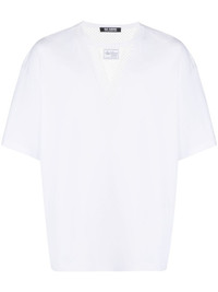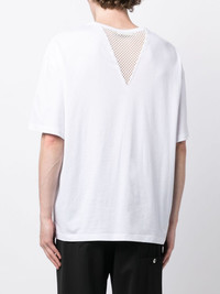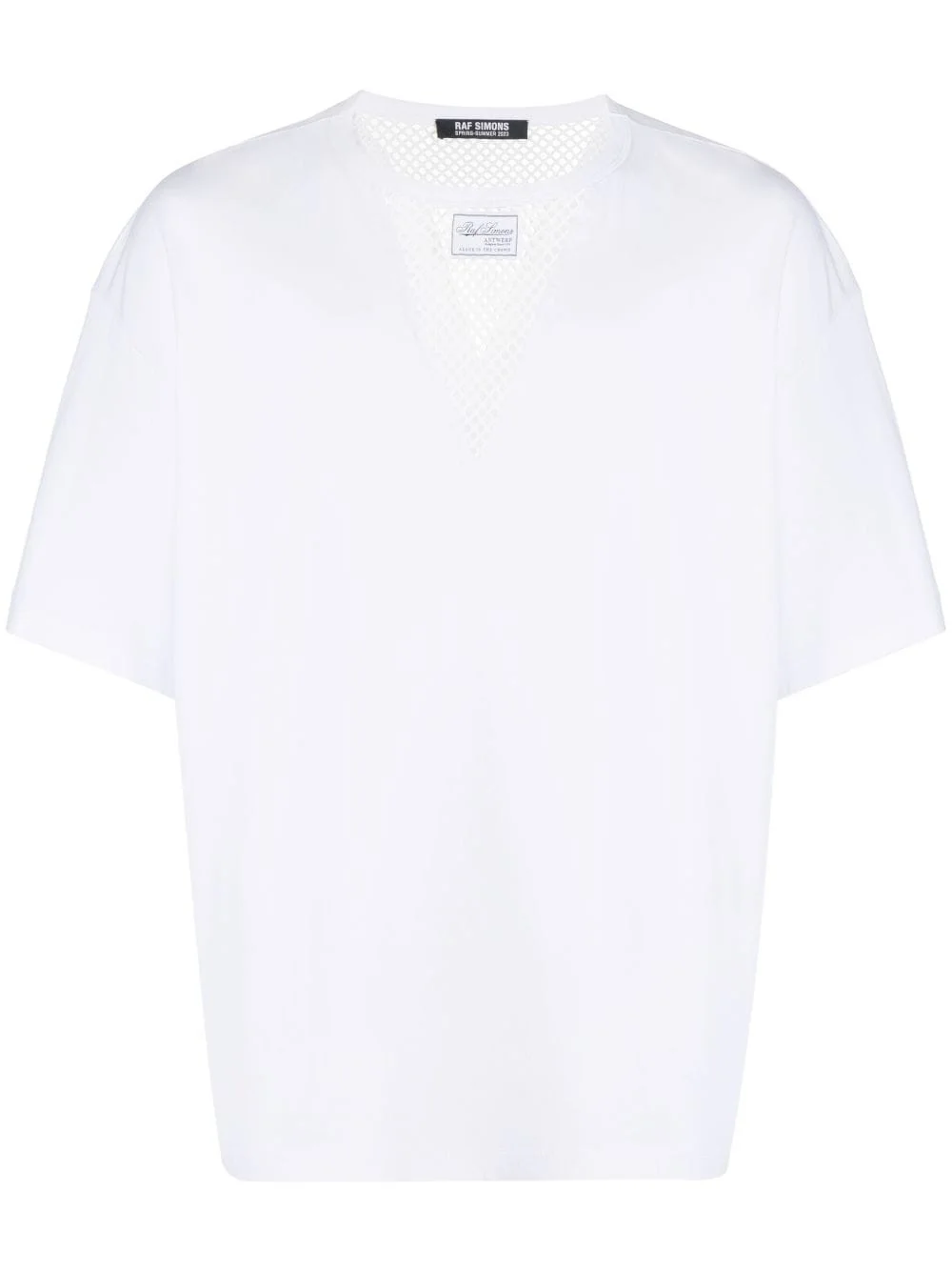 fishnet-panel short-sleeve T-shirt This Raf Simons’ short-sleeve T-shirt is cut from white cotton inset with a tonal fishnet panel. It's cut to an oversized fit and topped with a front logo patch. Highlights - White - Cotton - Mesh panelling - Logo patch to the front - Crew neck - Drop shoulder - Short sleeves - Straight hem Imported Composition Cotton 100% SIZE & FIT Model measurements Height 6 ft 2 in(1.87 m) Bust/Chest 36.22 in(92 cm) Hips 37.79 in(96 cm) Waist 28.34 in(72 cm) FittingInformation Designed for an oversized fit, offering additional room throughout Made from a midweight non-stretch fabric, this piece offers minimal elasticity when worn This piece fits true to size – take your usual size