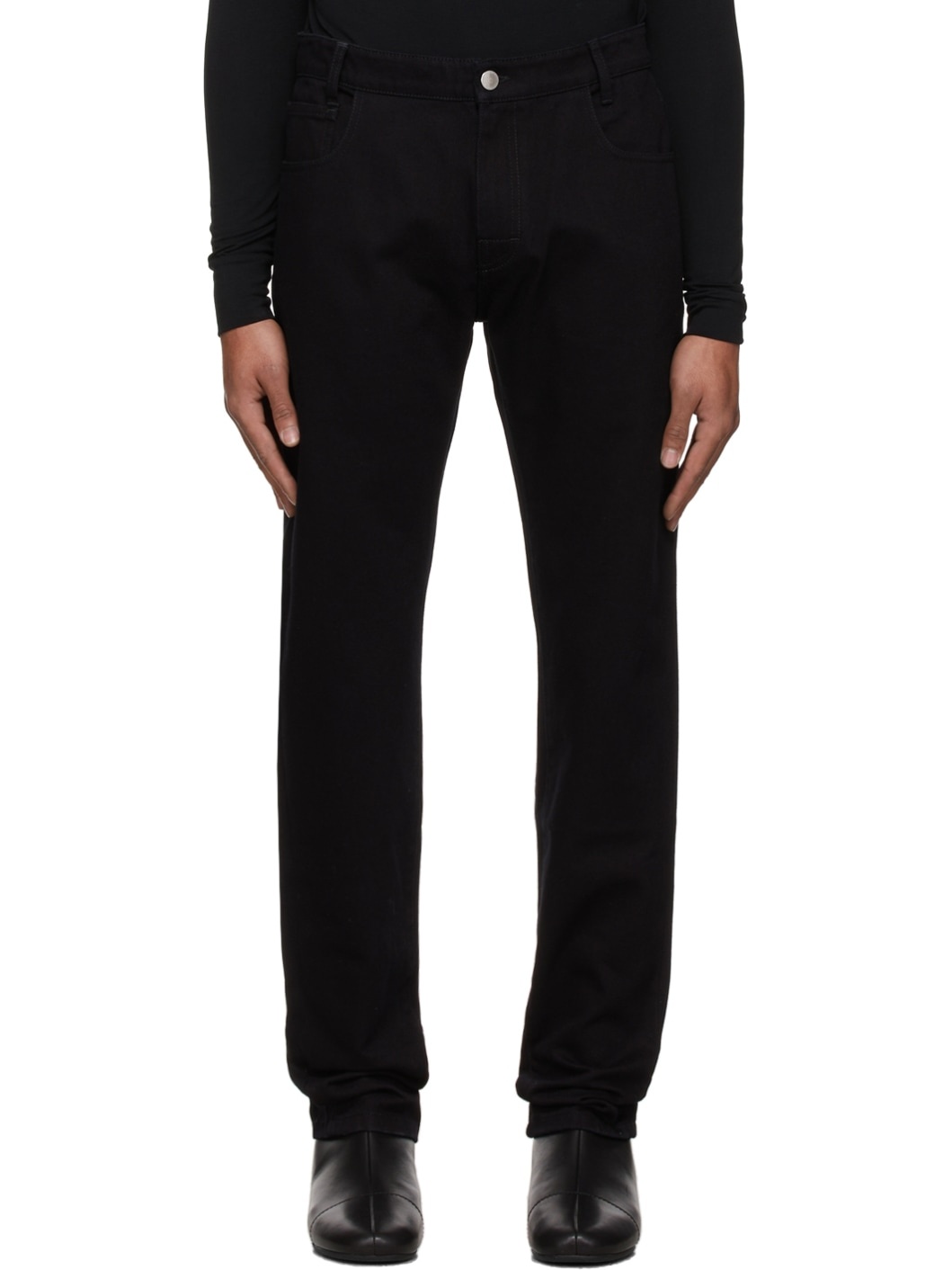 Slim-fit non-stretch denim jeans in black. · Mid-rise · Five-pocket styling · Belt loops at waistband · Logo patch at back waistband · Zip-fly · Silver-tone hardware Part of the Raf Simons x Smiley collaboration. Supplier color: Black 100% cotton.
