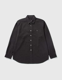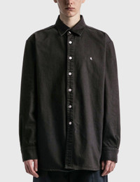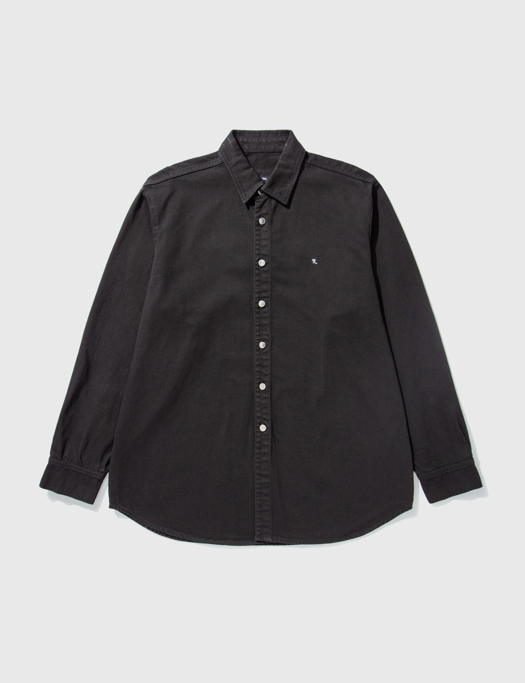 - Raf Simons - Straight Fit Denim Shirt - Long sleeve - Relaxed fit - Classic collar - Front button fastening - Chest embroidered monogram - Rear logo patch - Buttoned cuffs - Curved hem - Color: Black - Material: 100% Cotton - See more - Shirts - and - Clothing SIZING - Model wears size M - Model measures: Height 190cm, Chest 34”/84cm, Waist 28”/70cm, Hip 35”/90cm