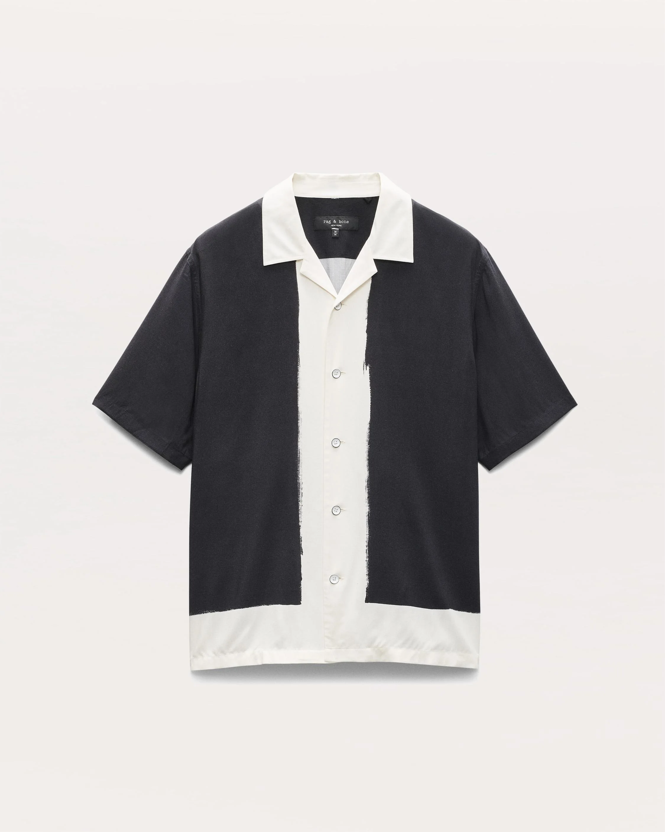Our short-sleeve take on the classic camp shirt, cut for a relaxed fit from a fluid, lightweight fabric. It's updated for the season in a painterly print inspired by 20th-century artists in the SoHos of New York and London, who famously captured the raw creative energy of the times. Take your typical size for a looser look, or size down for a closer fit. Size & Fit Relaxed fit Size Medium: Back length 27 3/8", chest 45 3/4", sweep 45", sleeve length 19 5/8" Model is 6'1" wearing size medium Features & Details 100% Viscose Machine wash, do not bleach, tumble dry low, low iron if needed or dry clean Distressed white buttons at center front Imported Product ID: MBW25SA027VIML