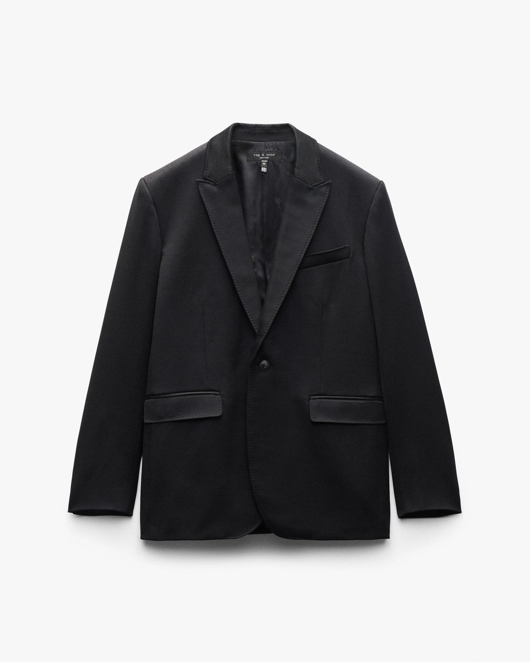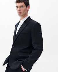 Our highest expression of heritage tailoring. Designed with a formal peak lapel, this single-breasted blazer is impeccably crafted in rich wool sourced from Abraham Moon, a legendary British mill that has produced some of the world's most storied textiles for nearly two centuries. Create a complete tuxedo with the Evan Italian Wool Tuxedo Trousers, or dress it down for everyday occasions by wearing over denim. Size & Fit • Fits true to size • Size 42: Body length 29.25", chest 43", sleeve length 35.25" • Model is 6'2" wearing size 40 Features & Details • Body: 100% wool • Lining: 52% polyester, 48% viscose • Fully lined in custom jacquard dagger lining • Dry clean only • Single-breasted silhouette • Peak lapel • Two-button closure • Functional buttoned cuffs • Signature dagger buttons • Welt pocket at the left chest and two waist flap pockets • Imported. British fabric produced in partnership with Abraham Moon. Product ID: RV5325F4MBR