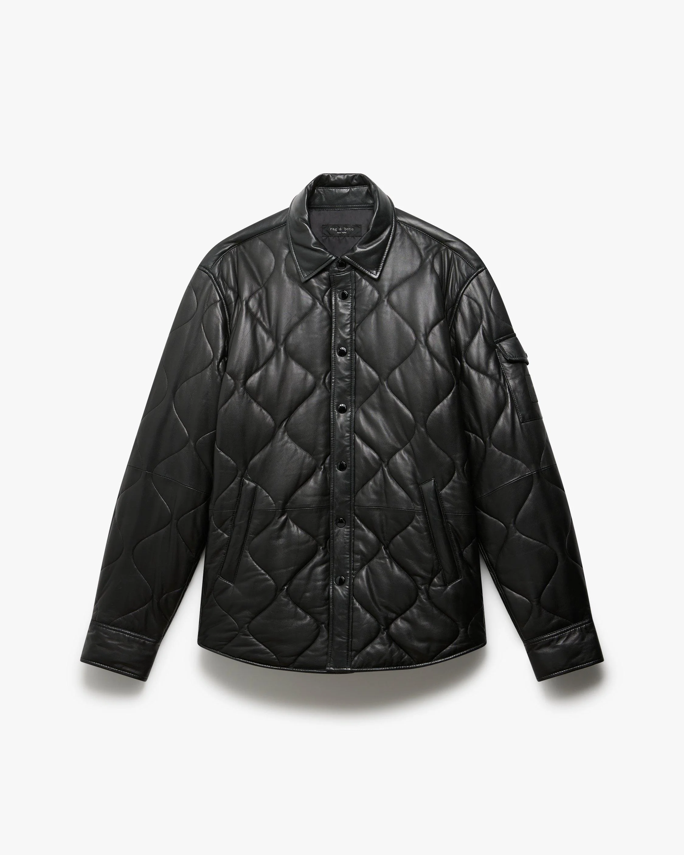 Form and function. Our best-selling Dane shirt jacket blends the classic cut of an overshirt with the utility of a down coat. Crafted from onion-quilted leather and lightly filled, it's a versatile essential that offers warmth without the bulk. Wear this ultimate transitional piece throughout the year, dressed up or down. Selected by Athena Calderone for The Gift of Style , the author and designer's edit of favorite pieces to give and receive. Size & Fit • Classic fit • Fits true to size • Size medium: Front length 29.75", chest 48.5", sweep 48", sleeve length 36" • Model is 6'2" wearing size medium Features & Details • Body: 100% lamb leather • Lining: jacquard • Fill: 100% polyester • Snap-front closure • Snaps at center front and sleeve cuffs • Onion quilting throughout • Leather logo patch at the left sleeve • Two angled welt pockets at the hip • Snapped flap pocket at the left sleeve • Professional leather clean only • Imported Product ID: RV6K25F0MLT