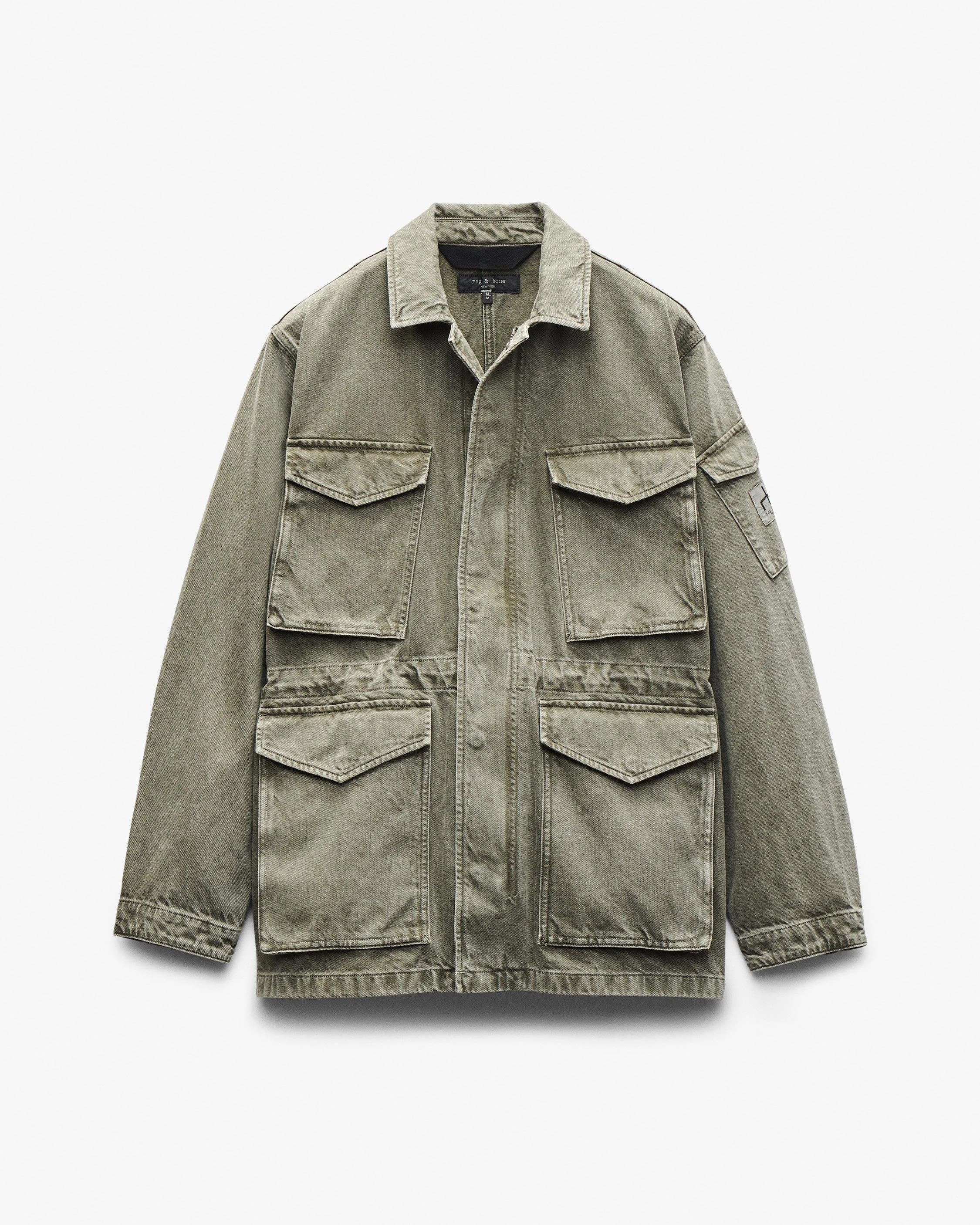 Reinterpreting the field jacket the rag & bone way. Retaining hallmarks of the classic military style, like multiple utilitarian pockets and a cinchable waist, this slightly relaxed rendition is cut from Authentic Rigid, a structured denim designed to break in, whisker, and fade over years of wear. Its tinted dark grey wash is created through an artisanal overdye process that results in a unique depth of color. The jacket takes its cues from the aesthetic culture of downtown New York City's New Wave music movement during the early 1980s, when diverse genres and vibrant experimentations in creativity set the stage for future celebrations of individuality. Size & Fit • Fits large to size. Consider sizing down for a closer fit. • Size Medium: Back length 30.5", chest 49", sleeve length 35.5" • Model is 6'2" wearing size medium Features & Details • 100% cotton • Machine wash cold inside out & tumble dry low • Hidden zipper and snaps at center front placket • Exposed snaps at cuffs with cuff adjuster snaps • Bungee cord at waist • Flap pockets • Zipper and snap closure • Imported Product ID: RV3525F0MDN