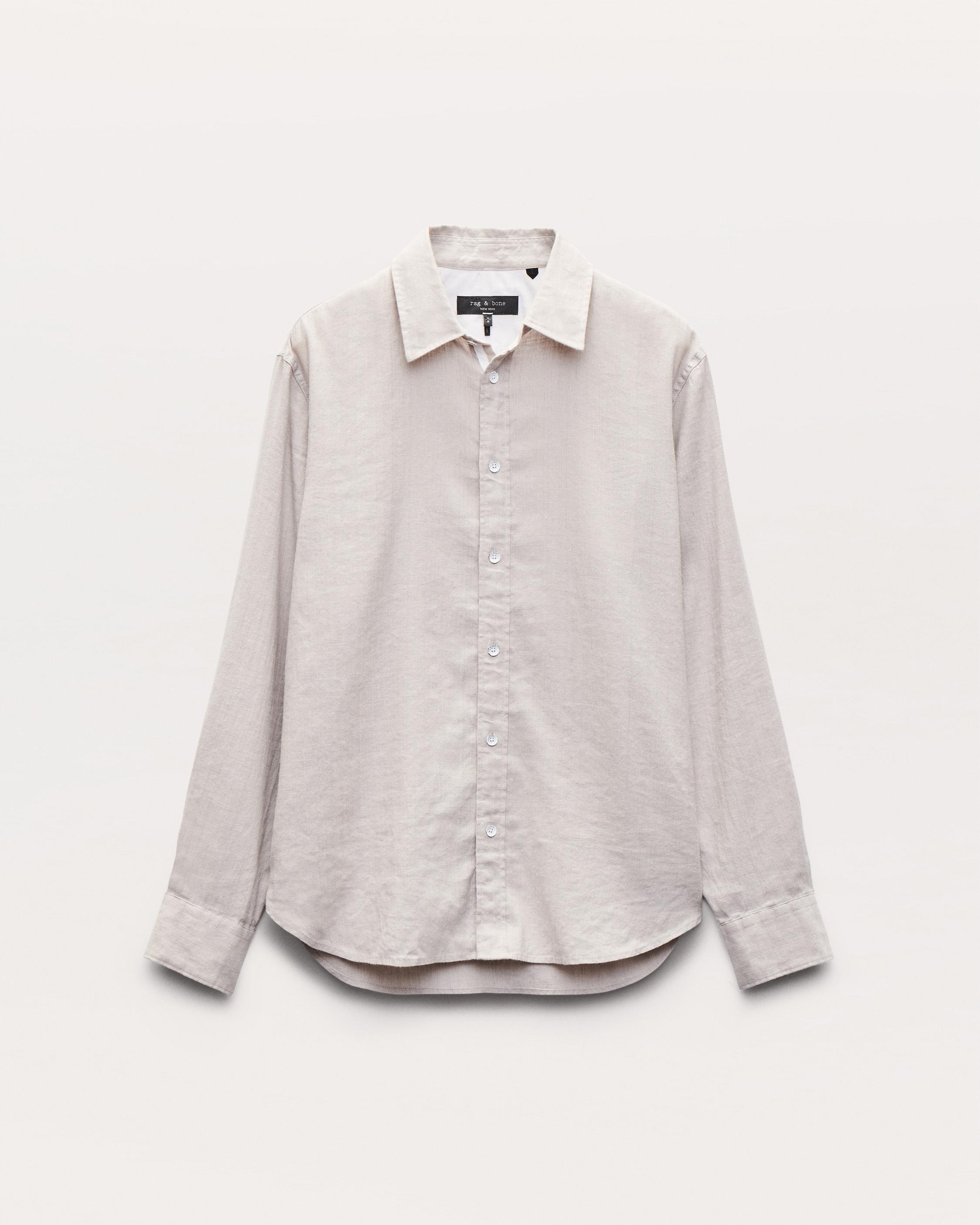 Your new essential summer shirt. Cut for a relaxed fit from an airy blend of linen and cotton, this version of our Finch button-up shirt feels effortlessly light and breathable in warmer weather. Size & Fit • Classic fit • Fits true to size • Size Medium: back length 29.75" | chest 47" | sleeve length 35.25" • Model is 6'3" wearing size medium Features & Details • 58% linen, 42% cotton • Distressed buttons at center front and cuff, bone button at the sleeve placket • Button closure • Machine wash cold on delicate & tumble dry low • Do not dry clean • Imported Product ID: MBW25PA019DEML