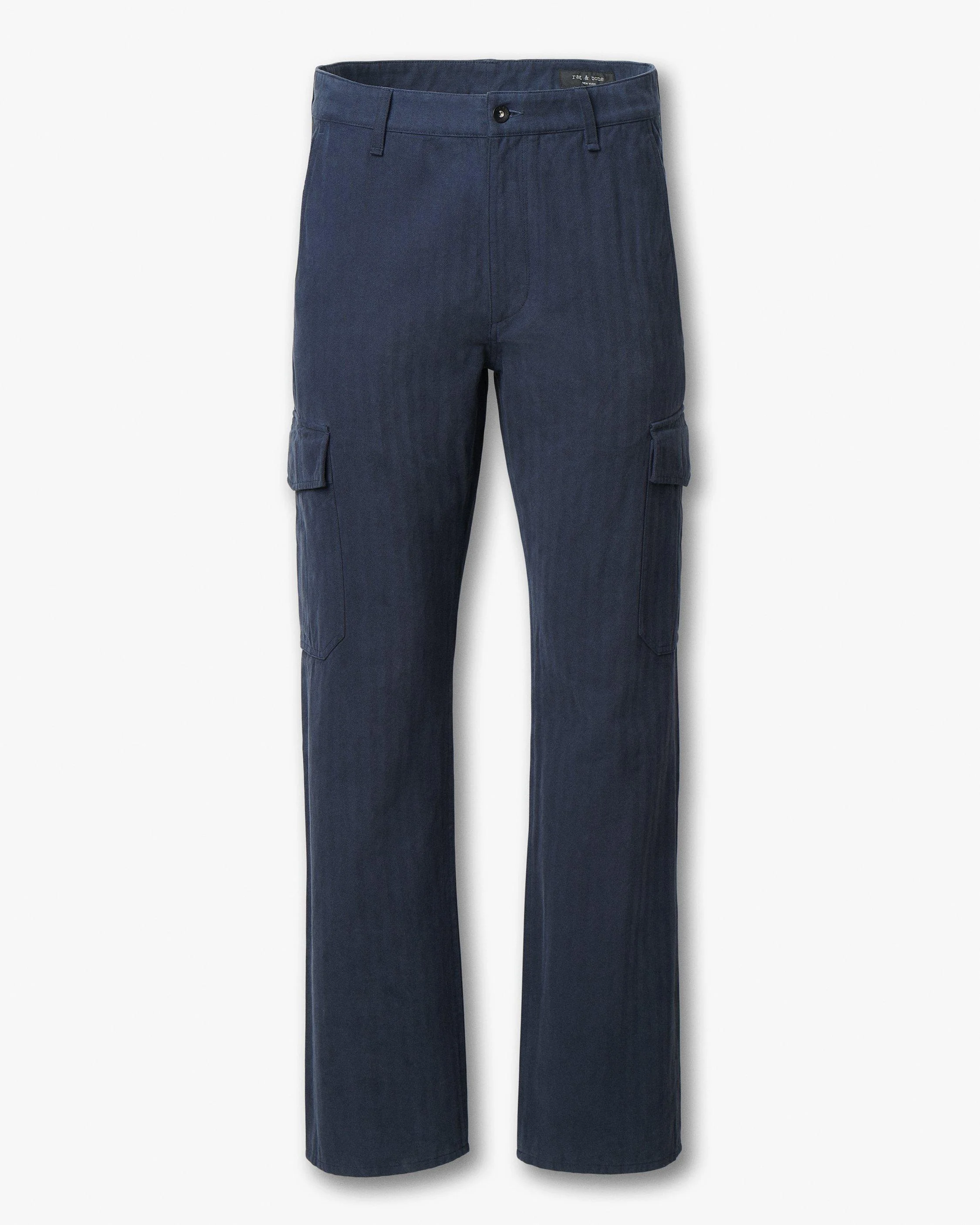 Fit 4. Our classic fit. Mid-rise cargo pants, relaxed through the hip and thigh, with a straight leg. Cut from a cotton-wool herringbone with a subtle stripe pattern and garment-dyed a rich navy blue. Size & Fit • Straight fit • Fits true to size • Size 32: Rise 11.5", inseam 31", leg opening 17.75" • Model is 6'2" wearing size 30 Features & Details • 80% cotton, 20% wool • Garment-dyed • Zip fly with button closure • Keeper button • Front slash pockets, cargo pockets, and back flap pockets • Machine wash cold & tumble dry low • Imported Product ID: RV9D25H7MCO