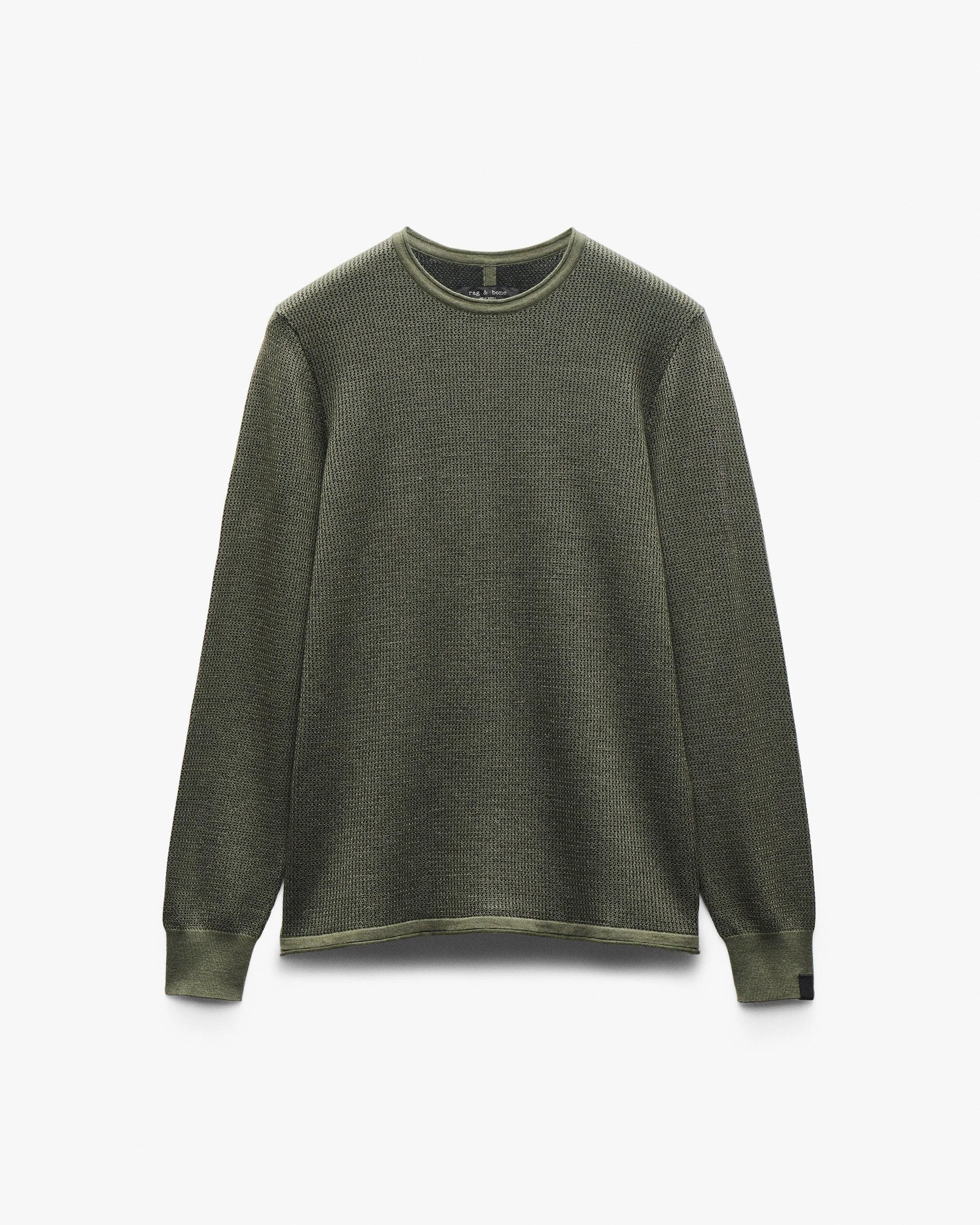 Sophisticated stitches. This crewneck sweater is knit from a fine merino wool blend with a distinct, honeycomb-like texture. Its light weight and slim fit make it ideal for wearing throughout the year, whether by itself or layered under a blazer or jacket. Size & Fit • Slim fit • Fits true to size • Size medium: Back length 25.75", chest 39.5", sweep 39", sleeve length 33.75" • Model is 6'2" wearing size medium Features & Details • 75% wool, 25% lyocell • Dry clean only • Suede rag & bone logo tab at sleeve cuff • Imported Product ID: RH3225F6MWL
