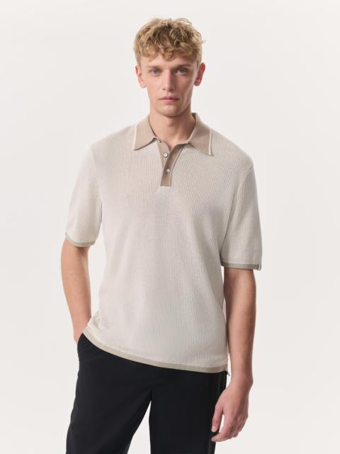 A rooted-in-retro rag & bone essential, rendered entirely for today. This short-sleeve polo shirt is knit with a vintage-inspired stitch from a breathable and surprisingly lightweight cotton blend, making it ideal for year-round wear. Contrast trims enhance its visual interest. Size & Fit Classic fit polo Size Medium: Back length 26 1/2", chest 42 1/4", sweep 41", sleeve length 19 1/4" Model is 6'0.5" wearing size medium Features & Details 66% Cotton, 24% Viscose, 10% Nylon Machine was cold inside out with like colors, gentle cycle, do not bleach, lay flat to dry, cool iron on the reverse side if needed Metal buttons at placket, suede RB logo tab at sleeve cuff Front neck button closure Imported Product ID: MBS24S017BC17