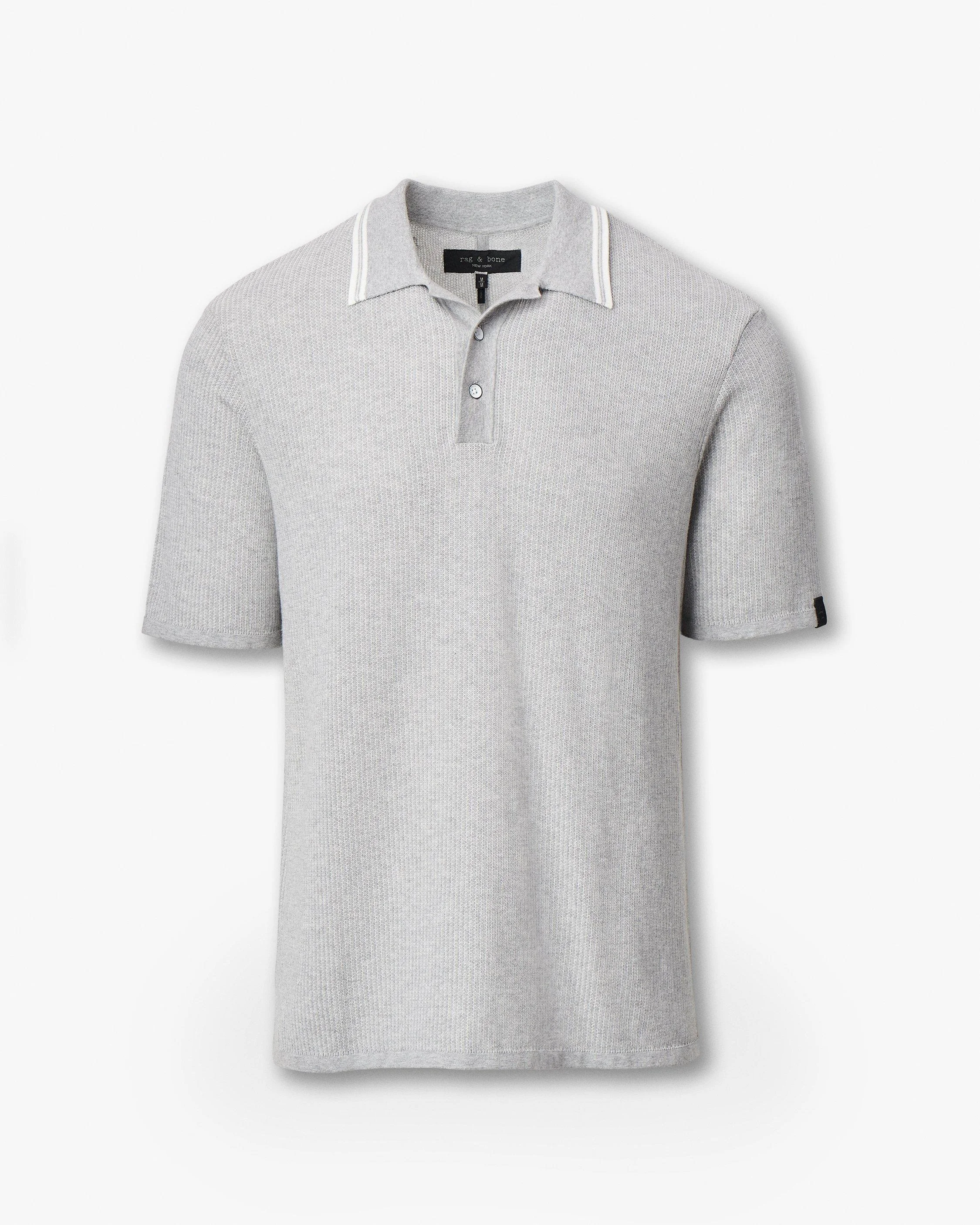A rooted-in-retro rag & bone essential, updated with striped tipping at the collar. Lightweight and breathable, this short-sleeve polo is crafted from cotton yarns that create a retro-inspired stitch with subtle texture, while contrasting solid trim enhances its visual interest. Ultra versatile, it's ideal for year-round wear. Size & Fit • Classic fit • Fits true to size • Size medium: Back length 26.5", chest 42.25", sweep 41", sleeve length 19.25" • Model is 6'1" wearing size medium Features & Details • 74% cotton, 20% viscose, 6% polyamide • Front-neck zipper closure • Suede logo tab at the left sleeve cuff • Dry clean or machine wash cold inside out on delicate & lay flat to dry • Imported Product ID: RH9125H6MCO