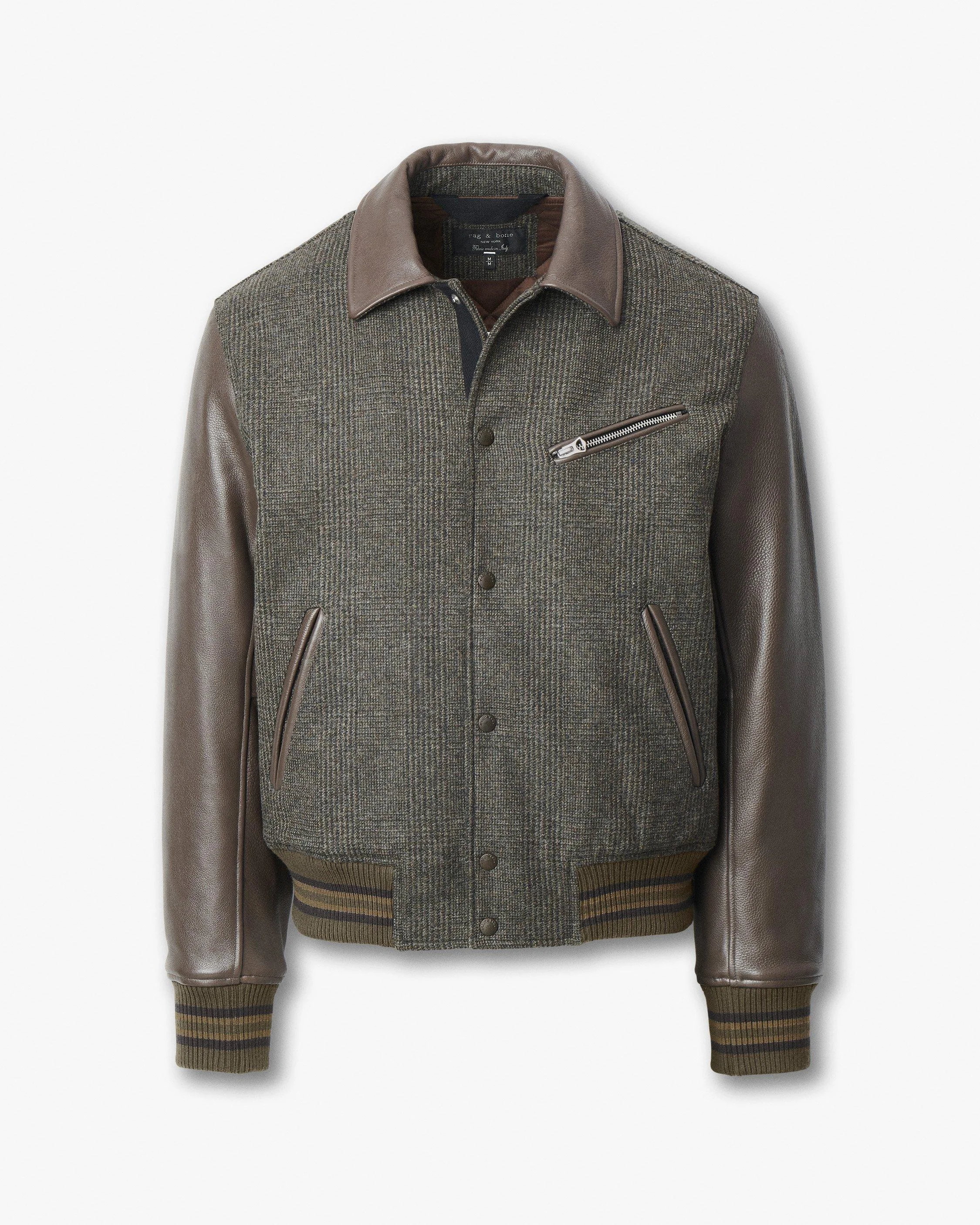 Our take on heritage style. Crafted in rich wool sourced from Abraham Moon, the legendary British mill that has produced some of the world's most storied textiles for nearly two centuries. Combining a plaid body with a leather collar and sleeves, this varsity-inspired style offers a modern take on a vintage look. Striped details at the hem and cuffs enhance its sportswear feel. Throw it on over the Evan Plaid Trousers to create a unique matching set. Size & Fit • Classic fit • Fits true to size • Size medium: Back length 25.75", chest 47", sweep 36.75", sleeve length 36" • Model is 6'2' wearing size medium Features & Details • 100% wool • Hidden full-zip front with a snapped placket • Leather collar • Diamond quilting • Abraham Moon mill label • Leather-trimmed left chest zip pocket and two leather-trimmed waist welt pockets • Dry clean only • Imported. British materials. Product ID: RV2E25H0MWO