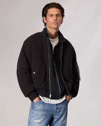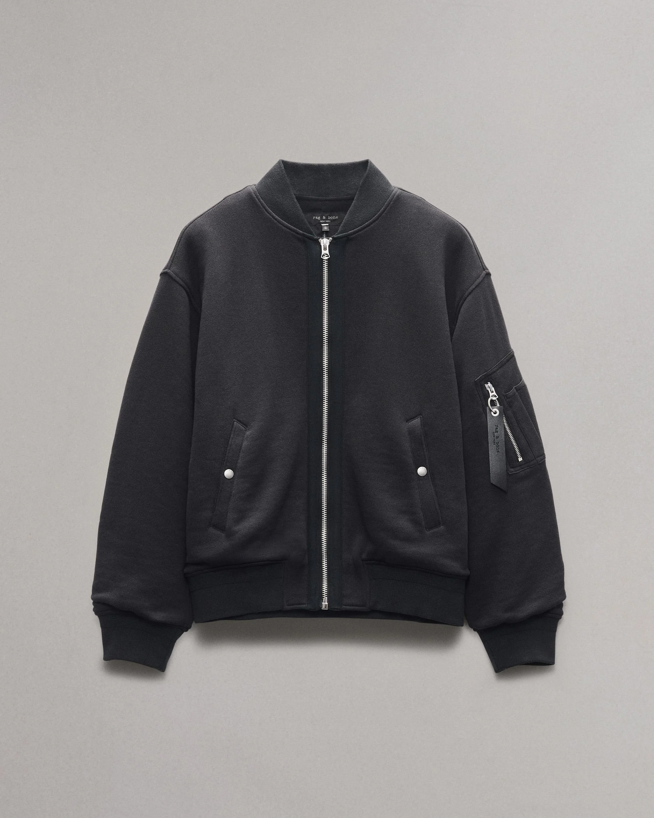 Inspired by vintage flight jackets, our quintessential bomber is crafted from an ultra-soft cotton-blend terry cloth and washed for a lived-in look. Detailed with ribbed trims, this oversized style features slip pockets and zips up the front. Take your typical size for a looser look, or size down for a closer fit. Size & Fit Classic Bomber Oversized Fit Size Medium: Center back length 26", Chest 51 1/2", Sweep 38", sleeve length 35 3/8" Model is 6'2.5" wearing a size medium Features & Details 78% Cotton 22% Polyester Lining: 100% Polyester Dry Clean Center front zipper, hidden spring snaps at center front placket over zipper, leather keyring at sleeve pocket, sleeve pocket zipper, rib at cuff, hem and collar Waist pocket and sleeve pocket Imported Product ID: MBC24HT010V810