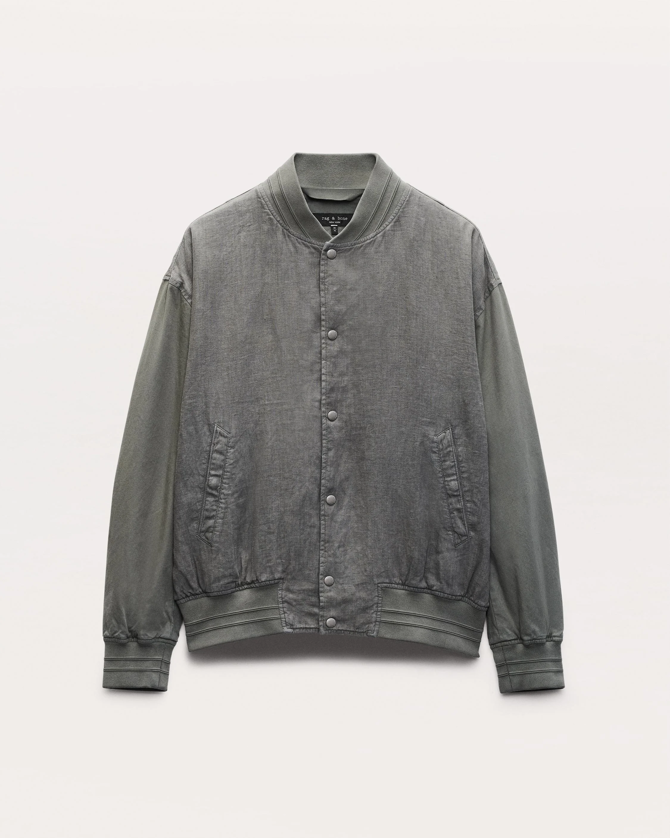 Referencing heritage souvenir, varsity, and bomber jackets, this modern layer is crafted with a lightweight linen body and cotton sleeves for summer days when the temperature dips. It's overdyed to create a unique depth of color enhanced by the shift in natural fabric textures across the garment. Hidden snaps secure the side pockets, while cuff adjusters ensure a snug fit. Size & Fit • Classic fit • Fits true to size • Size Medium: back length 25.75" | chest 49.5" | sleeve length 35.75" • Model is 6'2" wearing size medium Features & Details • 100% linen • Exposed snap closure • Exposed snaps at center front and cuffs, hidden snaps at the pocket flaps, and cuff adjusters • Side entry hip pocket • Machine wash cold & tumble dry low • Imported Product ID: MBW25P2003CUML