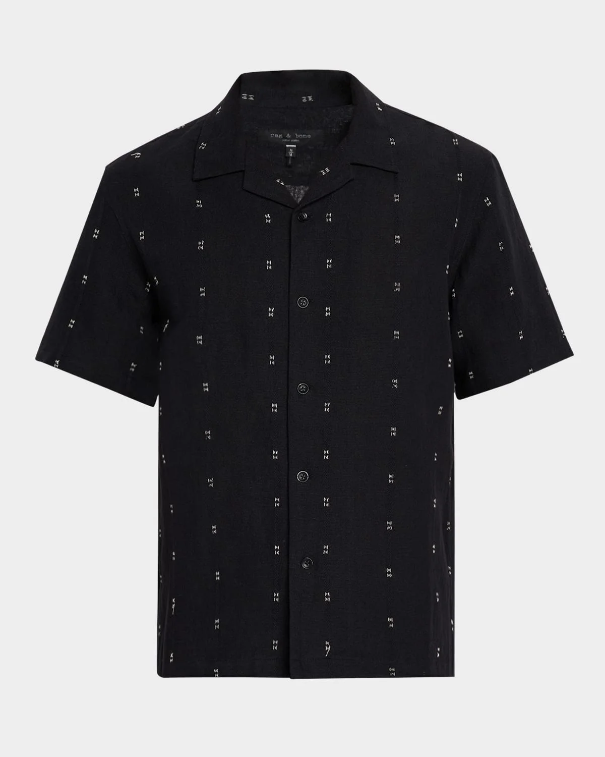 - Rag & Bone "Avery" shirt featuring contrast stitch details along tonal embroidered stripes - Camp collar - Button-down front - Short sleeves - Relaxed fit - Yoked back shoulders - Cotton/linen - Machine wash warm dry flat - Imported