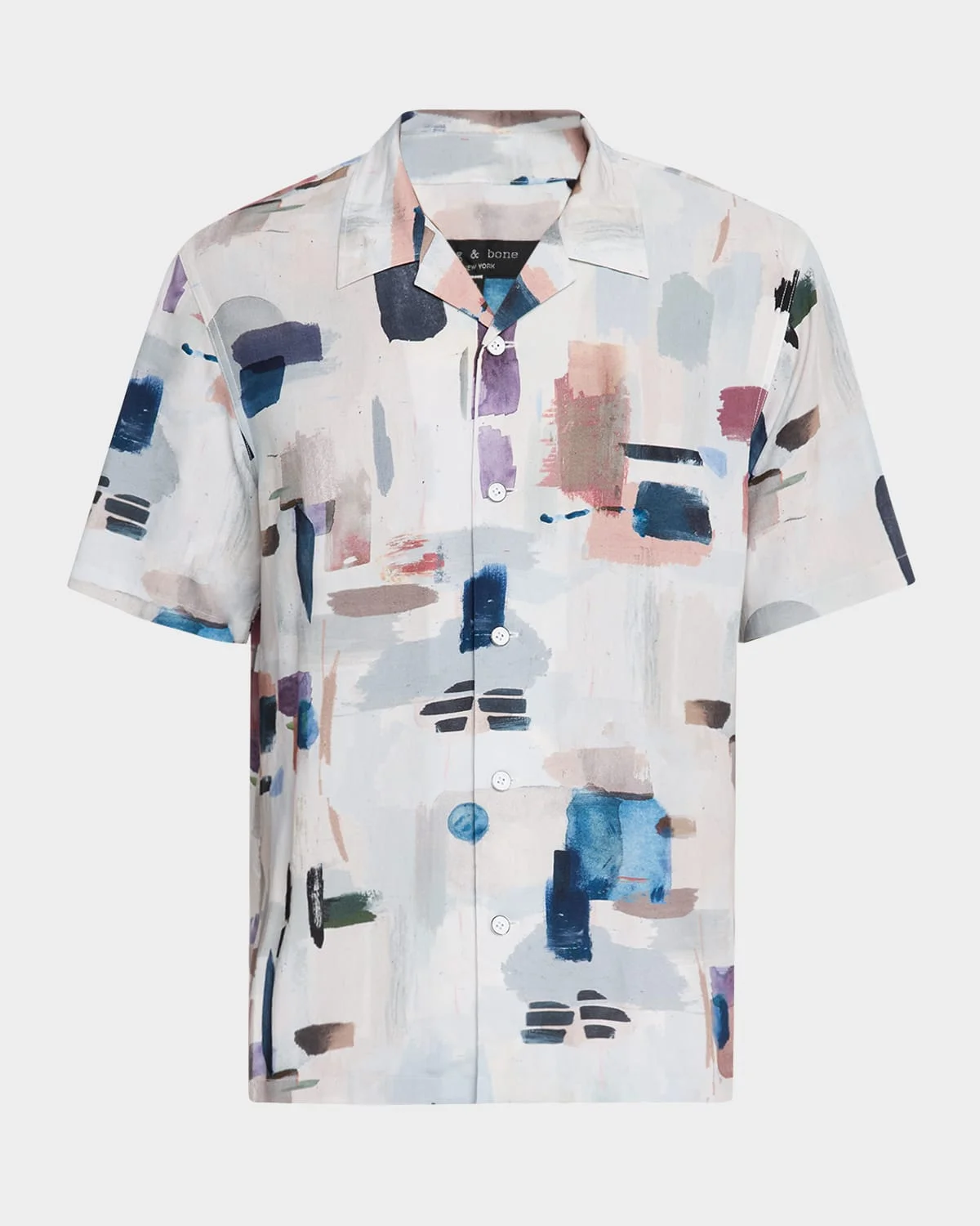 - Rag & Bone "Avery" sport shirt in multicolor abstract print - Camp collar - Button-down front - Short sleeves - Relaxed fit - Rayon/cellulose acetate - Machine wash cold, tumble dry - Imported
