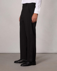 These relaxed fit-trousers are tailored from a fluid stretch wool blend with a muted pinstripe, making them easy yet refined. They're perfect for any holiday occasion—especially when paired with the matching Anton Striped Blazer. Size & Fit Relaxed fit Size 32: 13 1/4" front rise, 30 1/2" inseam, 17 1/4" leg opening Model is 6'3" wearing size 32 Features & Details 66% Wool 22% Polyester 9.5% Viscose 2.5% Spandex Dry clean only, no bleach, no tumble dry, cool iron if needed Front keeper button, hook and bar, piping at hip pocket opening, zipper fly, stripe at side seam Side seam pockets and back pockets Imported Product ID: MBW24H7009TXML