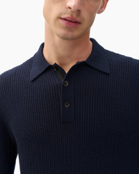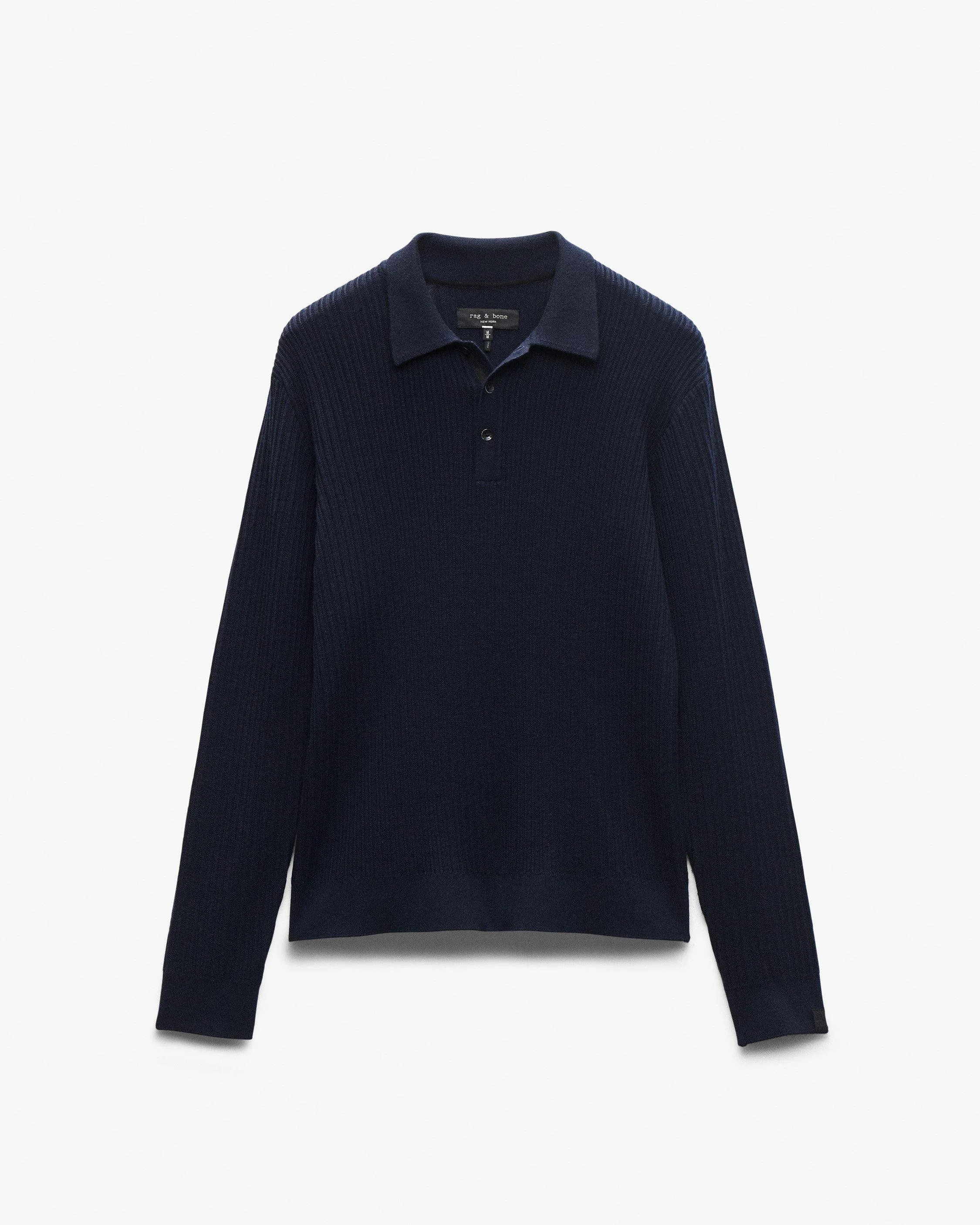 Next-level texture. This long-sleeve sweater combines the comfort of knitwear with the polish of a polo shirt. It's crafted from luxuriously soft wool and cashmere in a unique range of stitches that create tonal dimension. Fully-fashioned sleeves, fine ribbed trims, and a trim yet comfortable fit complete its elevated look. Size & Fit • Trim fit • Fits true to size • Size medium: Back length 26", chest 40", sweep 39", sleeve length 33.75" • Model is 6'2" wearing size medium Features & Details • 87% wool, 13% cashmere • Dry clean only • Suede rag & bone logo tab at sleeve cuff • Metal buttons at front placket • Imported Product ID: RH2625F6MWH