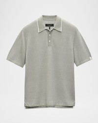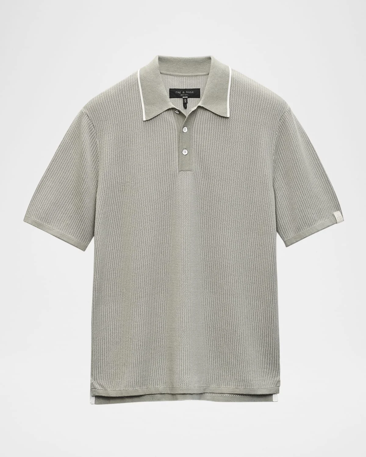 - Rag & Bone "Harvey" striped knit polo - Spread collar; two-button front - Short sleeves - Suede logo patch at sleeve cuffs - Classic fit - Pullover style - Cotton/viscose/Amni® nylon - Machine wash cold, line dry, wash inside out - Imported - Model is 6'1"/185cm.