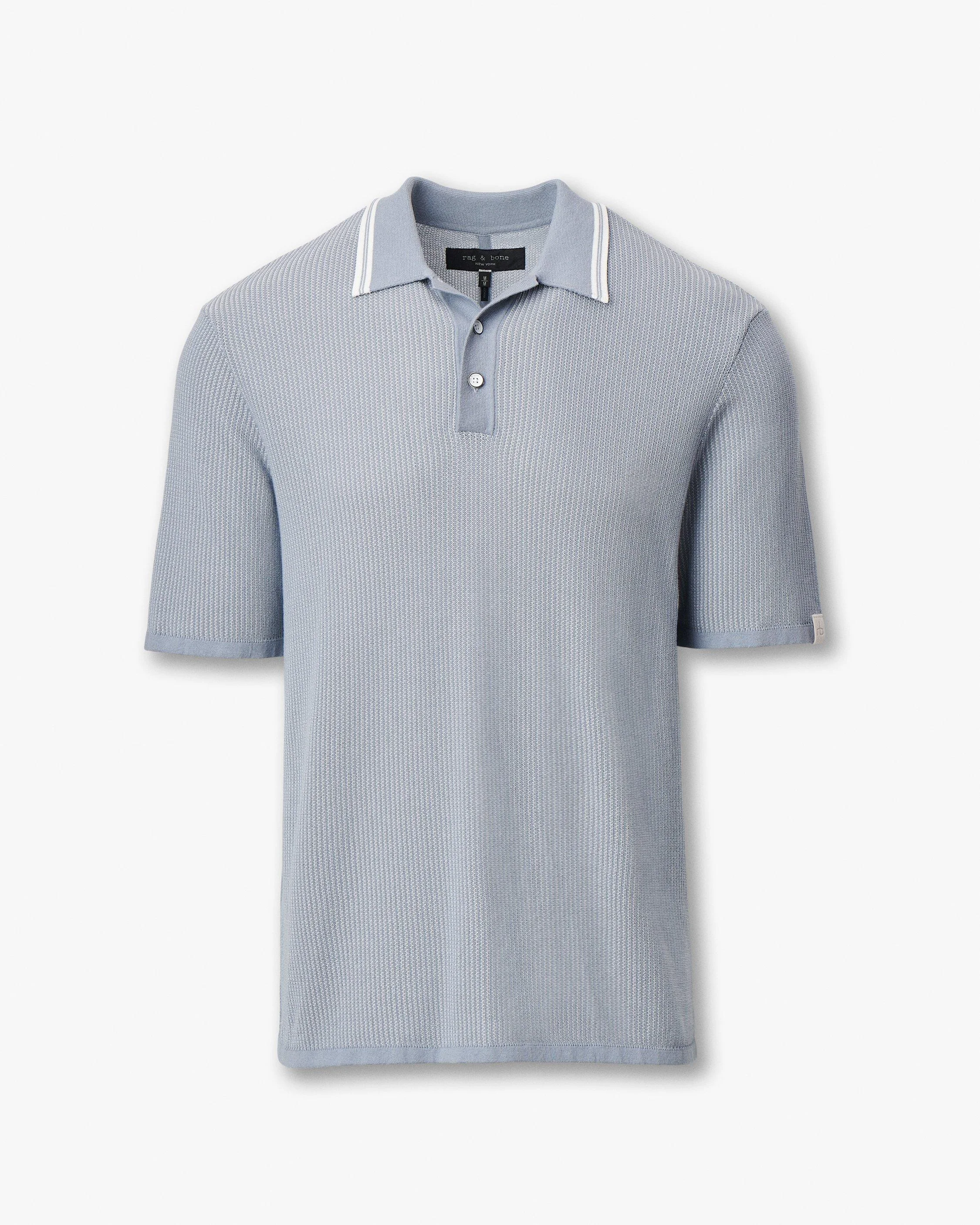 A rooted-in-retro rag & bone essential, updated with striped tipping at the collar. Lightweight and breathable, this short-sleeve polo is crafted from cotton yarns that create a retro-inspired stitch with subtle texture, while contrasting solid trim enhances its visual interest. Ultra versatile, it's ideal for year-round wear. Size & Fit • Classic fit • Fits true to size • Size medium: Back length 26.5", chest 42.25", sweep 41", sleeve length 19.25" • Model is 6'1" wearing size medium Features & Details • 74% cotton, 20% viscose, 6% polyamide • Front-neck zipper closure • Suede logo tab at the left sleeve cuff • Dry clean or machine wash cold inside out on delicate & lay flat to dry • Imported Product ID: RH9125H6MCO