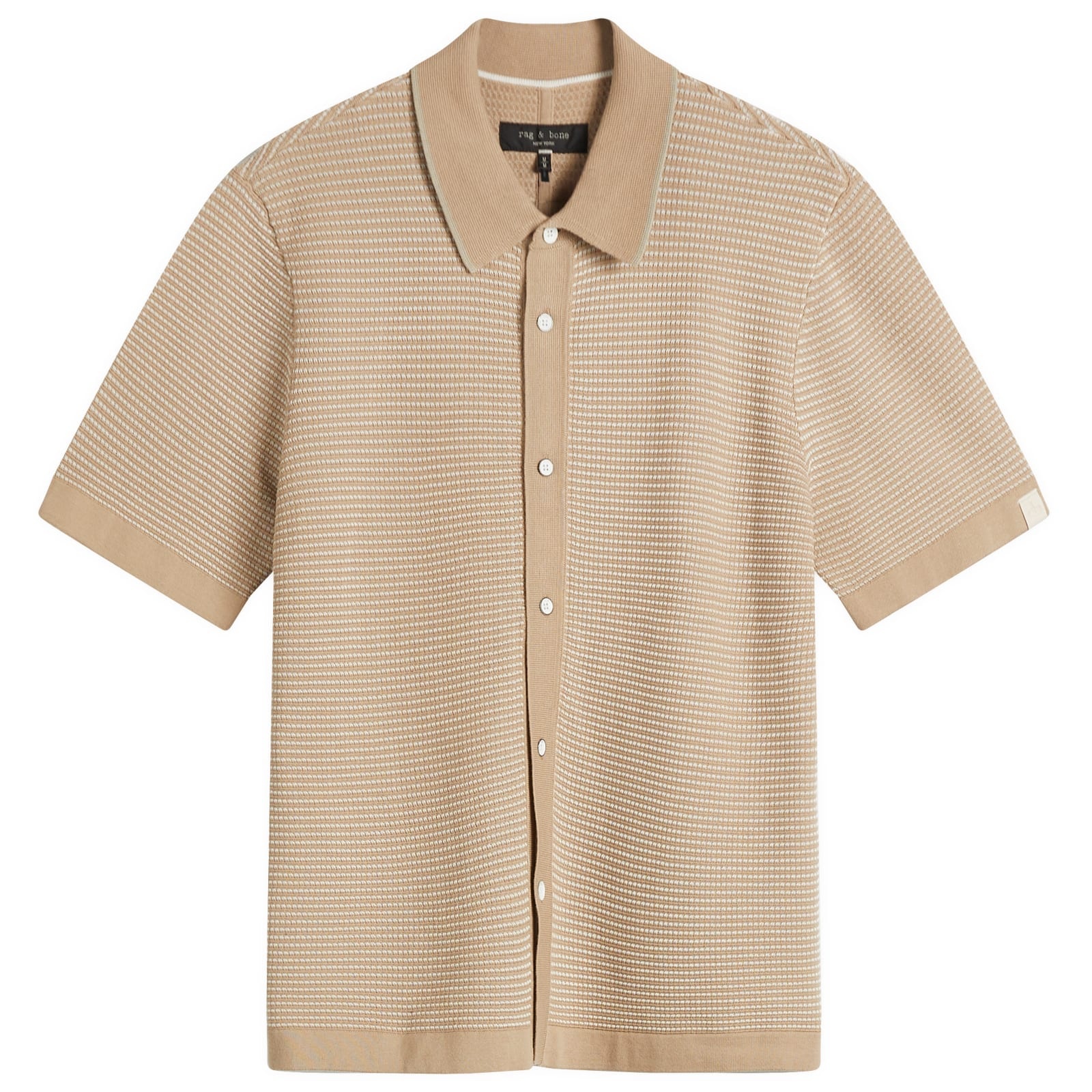 The Rag & Bone Harvey jacquard stripe shirt channels vintage style with contemporary craftsmanship. Woven in a breathable cotton-blend yarn, its intricate stripe pattern adds depth and texture, while a suede logo tab at the sleeve cuff adds a signature touch. Bringing a retro feel, this versatile staple elevates your look. - 90% Cotton, 8% Viscose, 2% Nylon - Metal Button Closure - Herringbone Tape - Jacquard Knit - Branded Tab - Cold Machine Wash