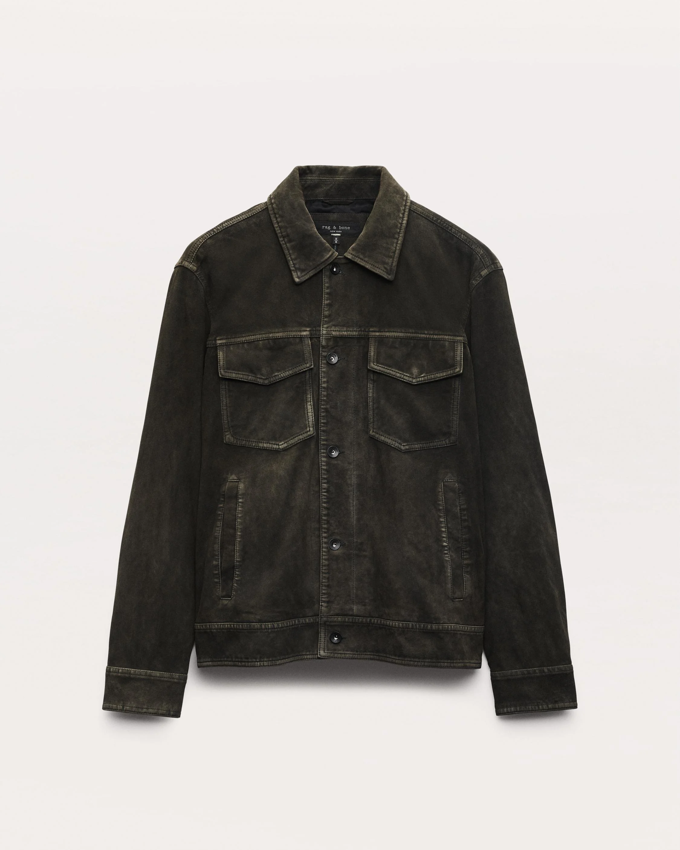 The denim trucker jacket, reinterpreted in velvety suede. This elevated, fully-lined layer is dyed and washed to create a beautiful depth of color with nuanced highs and lows throughout the garment. Size & Fit • Classic fit • Fits true to size • Size Medium: back length 26" | chest 48.5" | sleeve length 35.25" • Model is 6'3" wearing size medium Features & Details • 100% goat leather • Button closure • Shank buttons at center front and cuff, hidden snaps at the pocket flaps • Classic front pockets and back pockets • Professional leather clean only • Imported Product ID: MBW25P2015LTML
