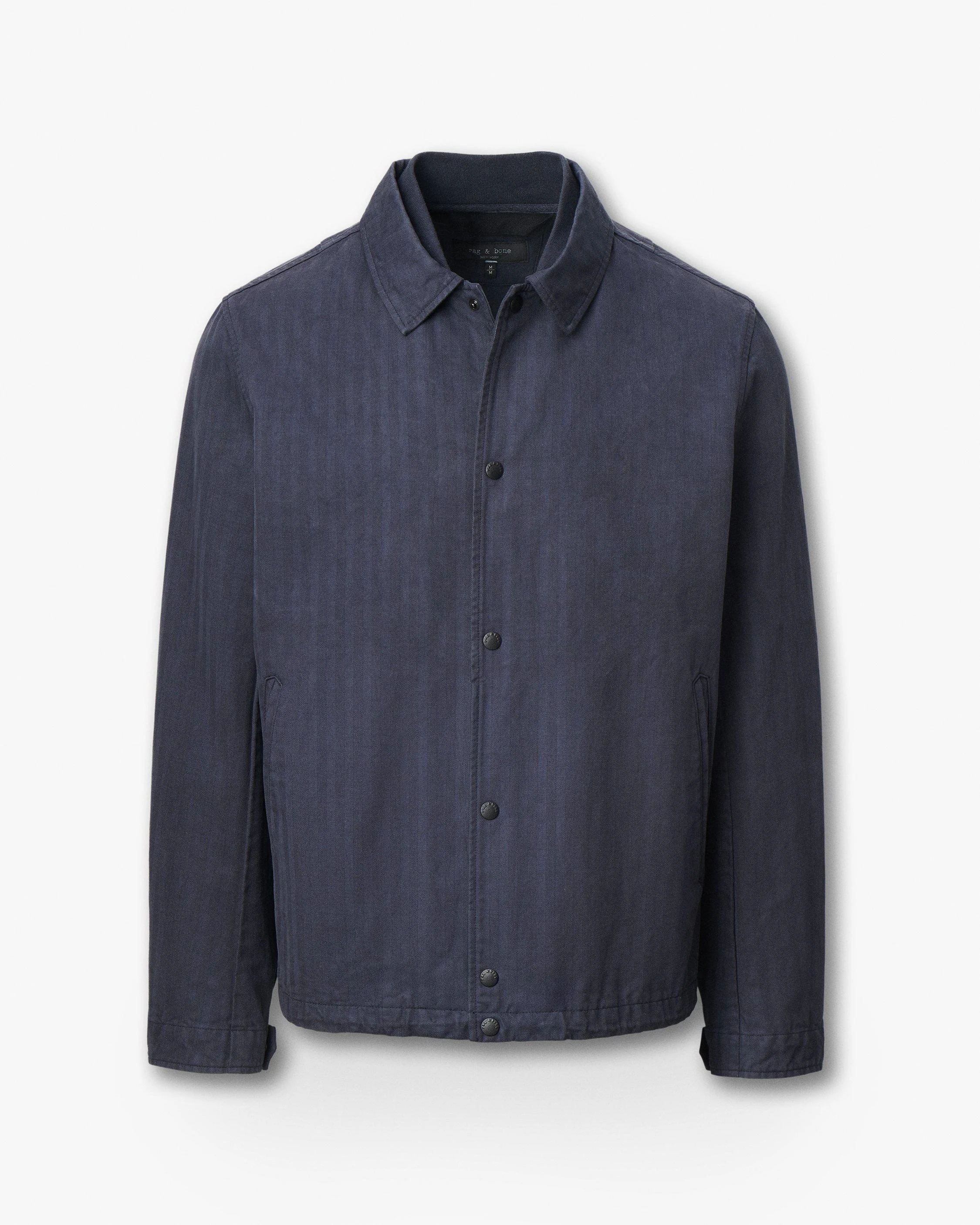 This classic coaches jacket is cut from a soft, surprisingly lightweight cotton-wool blend with a subtle stripe effect. A double collar brings the silhouette unique depth and detail, while an adjustable bungee at the hem lets you fine-tune the fit. Snap it up to the neck to keep it sleek or wear it open for an effortless feel. Pair with the Fit 4 Straight Cargo Pants for a matching look. Size & Fit • Classic fit • Fits true to size • Size medium: Length 27", chest 47", sweep 44.5", sleeve length 35.5" • Model is 6'2" wearing size medium Features & Details • 80% cotton, 20% wool • Garment-dyed • Front snap closure • Cuff-adjuster snaps • Bungee adjuster at hem • Waist welt pockets • Machine wash cold & tumble dry low • Imported Product ID: RV1G25H0MCW