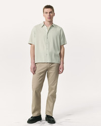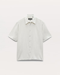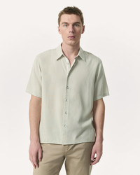 Look closely at this version of our favorite short-sleeve button-up shirt. The subtle stripes are created with dimensional dobby stitches, which add a touch of texture to its lightweight woven fabric. Size & Fit Relaxed fit Size Medium: Back length 27 1/2", chest 46 1/2", sweep 45 1/2", sleeve length 20 1/4" Model is 6'1" wearing size medium Features & Details 85% Rayon, 15% Cotton Machine wash cold with like colors Distressed black buttons at center front Black cotton grosgrain tape under buttons Imported Product ID: MBW25SA032RCML