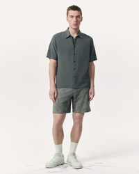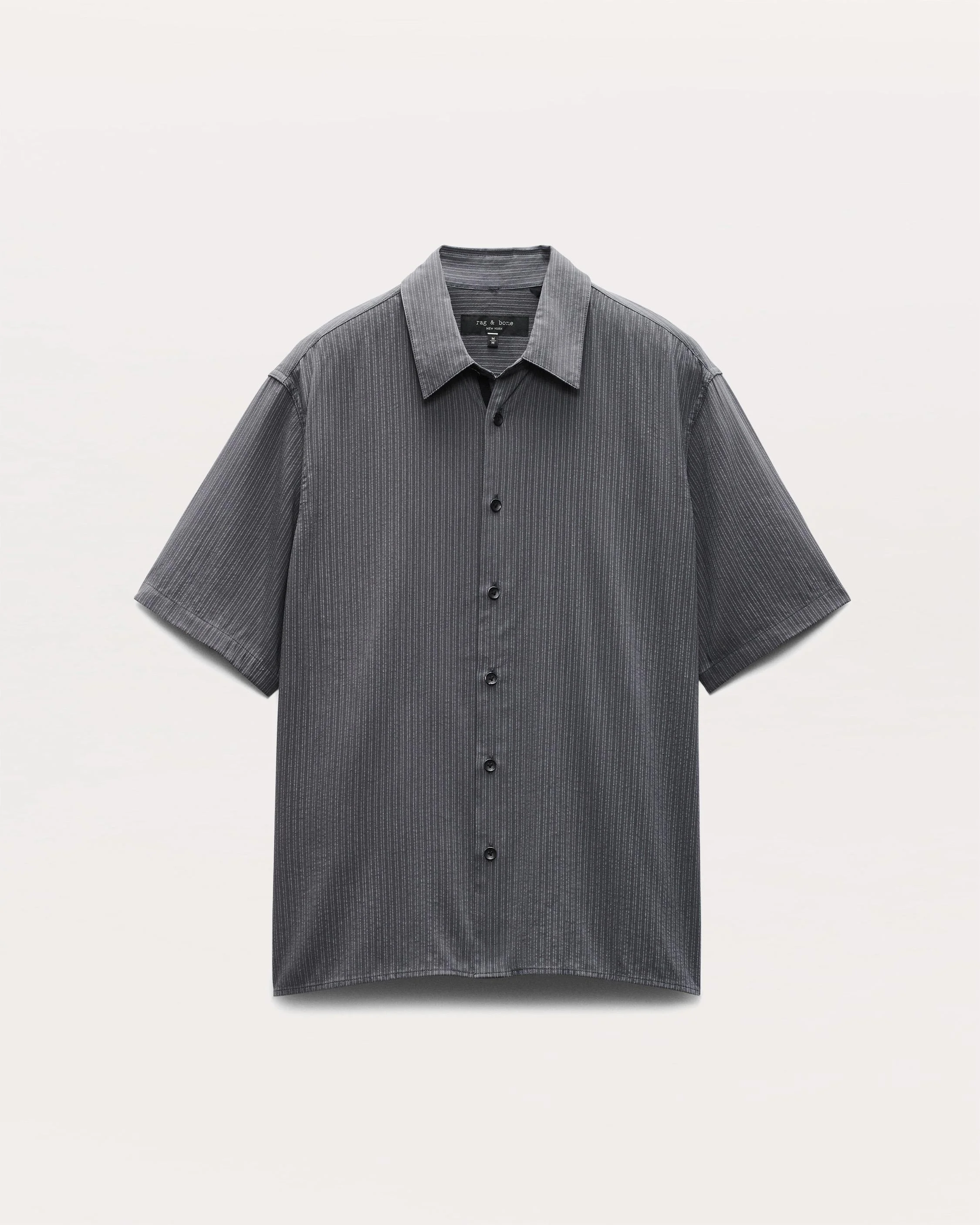 Look closely at this version of our favorite short-sleeve button-up shirt. The subtle stripes are created with dimensional dobby stitches, which add a touch of texture to its lightweight woven fabric. Size & Fit Relaxed fit Size Medium: Back length 27 1/2", chest 46 1/2", sweep 45 1/2", sleeve length 20 1/4" Model is 6'1" wearing size medium Features & Details 85% Rayon, 15% Cotton Machine wash cold with like colors Distressed black buttons at center front Black cotton grosgrain tape under buttons Imported Product ID: MBW25SA032RCML