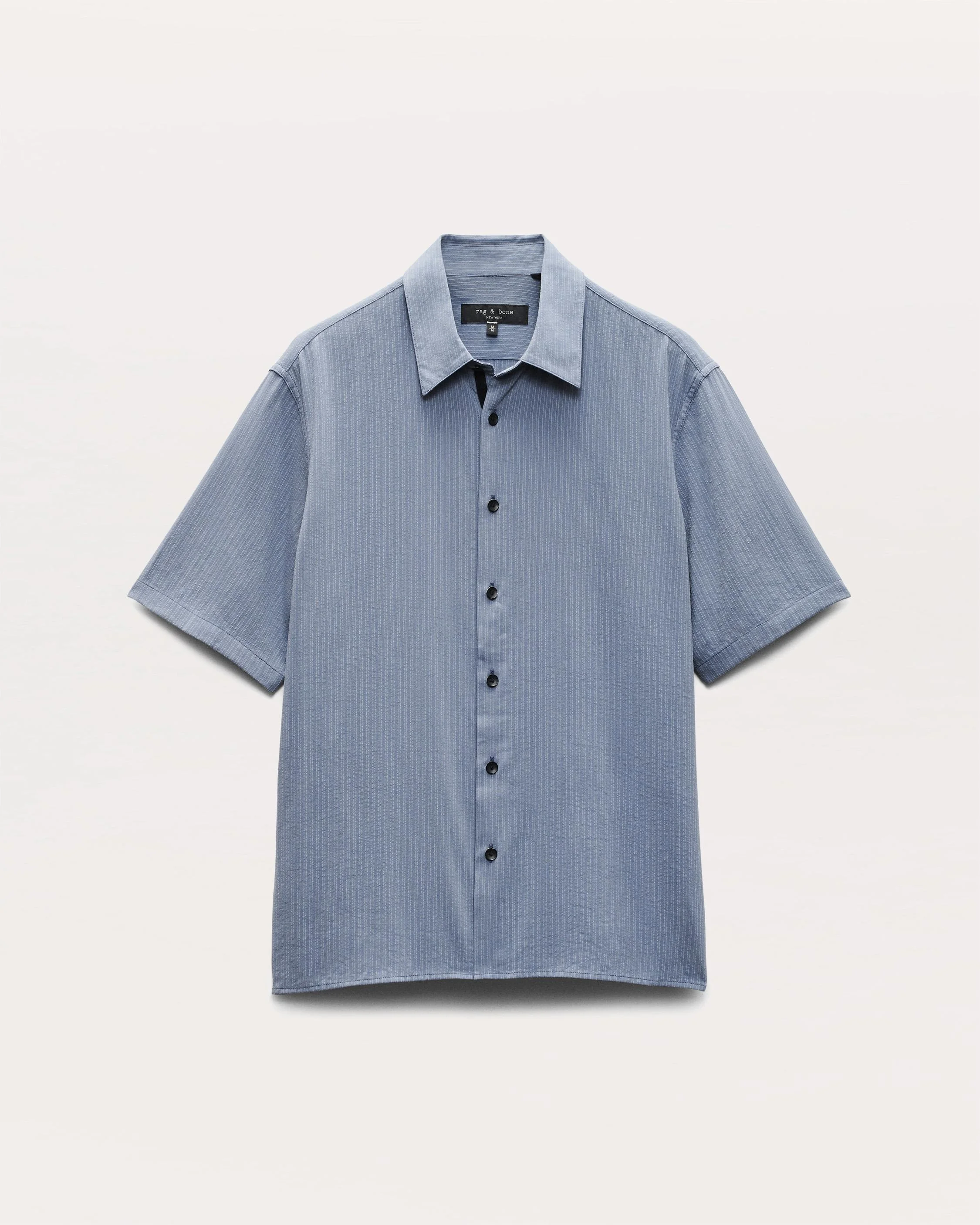 Look closely at this version of our favorite short-sleeve button-up shirt. The subtle stripes are created with dimensional dobby stitches, which add a touch of texture to its lightweight woven fabric. Size & Fit Relaxed fit Size Medium: Back length 27 1/2", chest 46 1/2", sweep 45 1/2", sleeve length 20 1/4" Model is 6'1" wearing size medium Features & Details 85% Rayon, 15% Cotton Machine wash cold with like colors Distressed black buttons at center front Black cotton grosgrain tape under buttons Imported Product ID: MBW25SA032RCML