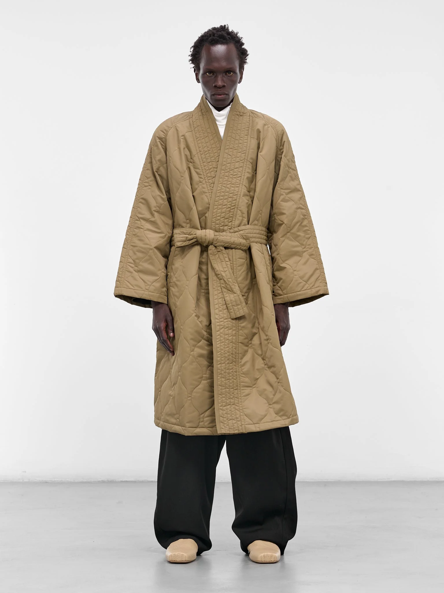 The olive kimono coat balances softness and structure with its quilted, padded construction and relaxed, mid-length profile finished by a self-tie belt at the waist. Featuring: • Relaxed fit • Stand collar • Kimono-inspired design • Quilted and padded construction • Raglan long sleeves • Self-tie belt fastening at waist • Mid-length • Made in Japan • 100% Nylon • One size Model is 5'11.5" wearing size OS. Shoulders: 16" Chest: 32.5" Waist: 30"
