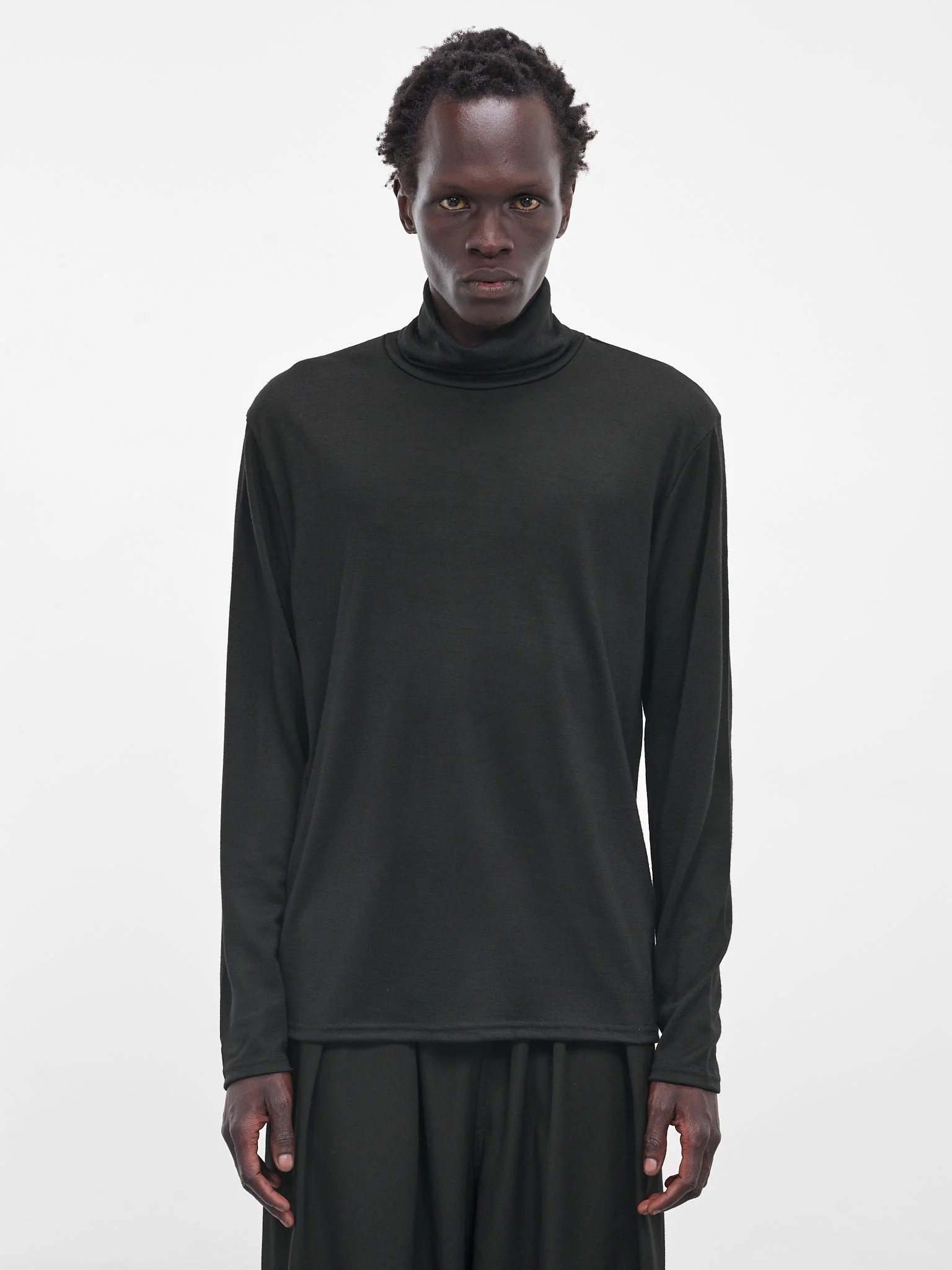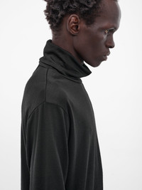 The black sweater is designed with a relaxed silhouette and features a classic turtleneck and long sleeves, emphasizing understated comfort. Featuring: • Relaxed fit • Turtleneck • Long sleeves • Made in Japan • 100% Wool • Japanese sizing Model is 5'11.5" wearing size 5. Shoulders: 16" Chest: 32.5" Waist: 30"