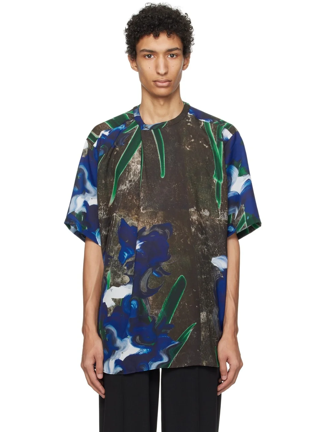 Polyester satin shirt. Graphic pattern printed throughout. · Button expansion panel at band collar · Pleat at front · Shirttail hem Supplier color: Rinpa 100% polyester. Made in Japan 241599M192001