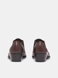 Brown leather shoes with a smooth, polished surface and embossed detailing. The pointed toe and Cuban heel combine classic tailoring with sharp modern refinement. Featuring: • Low-cut shape • Leather construction with smooth finish • Embossed graphic detailing • Elastic gussets at sides • Pointed toe and Cuban heel • Leather and rubber sole • Lined interior • Made in Japan • Upper: 100% Cow Leather | Sole: 100% Rubber • Japanese sizing
