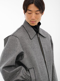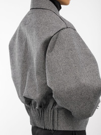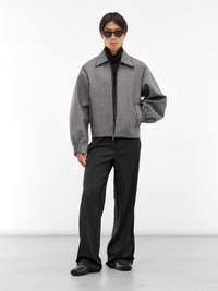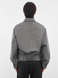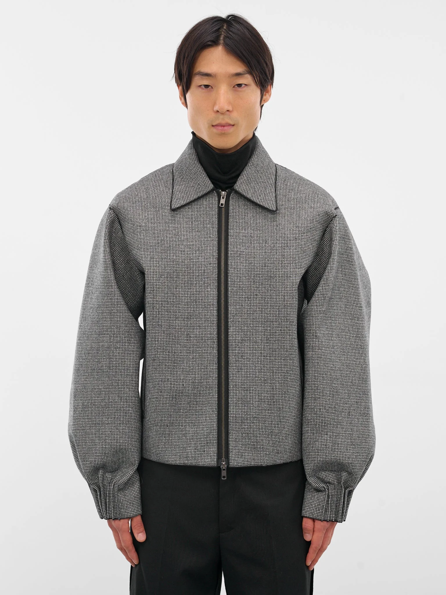 Black and white houndstooth jacket in wool with an oversized boxy profile, spread collar and two-way zip closure. Featuring: • Oversized fit • Houndstooth pattern • Spread collar • Two-way zip closure • Long sleeves • Elasticated cuffs and back hem • Lined • Made in Japan • Main: 99% Wool 1% Polyurethane | Lining: 100% Polyester • Numeric sizing Model is 6'1" wearing size 5. Shoulders: 18" Chest: 36" Waist: 28"