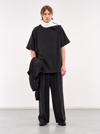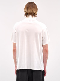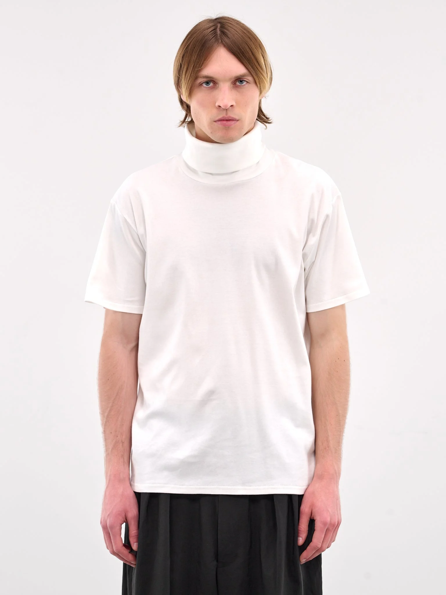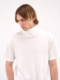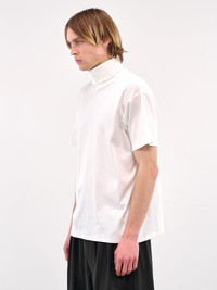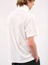 Soft white cotton and subtle paneling give this turtleneck tee a polished, easy drape. This short-sleeved turtleneck is the ideal versatile layer for everyday and going out. Featuring: • Relaxed fit • Paneled construction for subtle structure • Turtleneck and short sleeves • Straight hem • Made in Japan • 100% Cotton • Numeric sizing Model is 6'1.5" wearing size 6. Shoulders: 18.5" Chest: 37" Waist: 31"