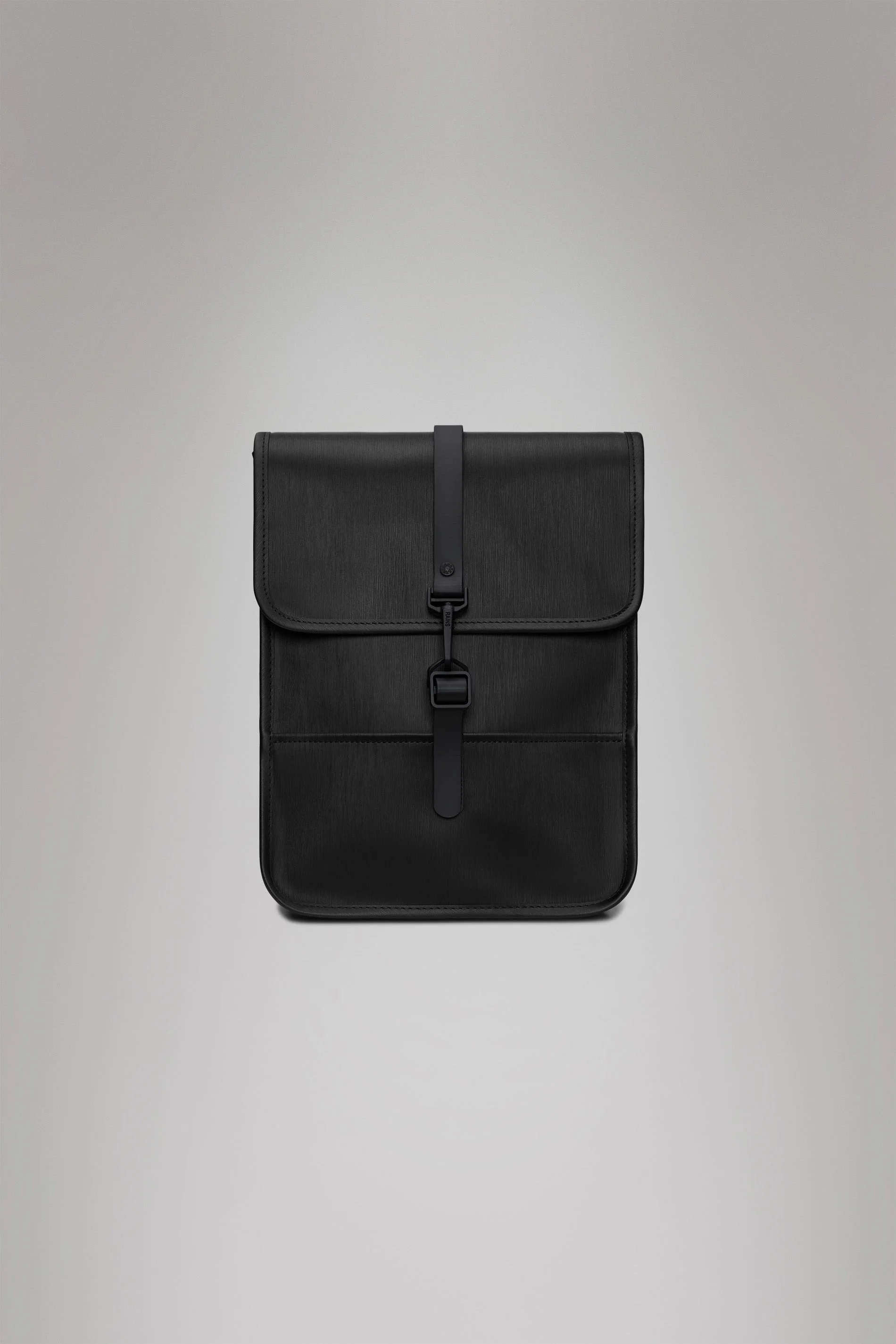 Backpack Micro is a downscaled version of Backpack Mini. Design is characterized by its squared shape and flap with magnet snap fastenings. This clean and ever contemporary rucksack features an internal laptop pocket and a spacious main compartment. The laptop pocket fits a 11" laptop, making the squared backpack a perfect computer-ready staple for commuting on bike or by foot. Backpack Micro is cut from Rains' signature PU fabric, engineered for carrying strength, durability and a smooth feel. SKU: 13010\84 Details Volume (liter): 1.8 gal Composition: 100.00% PES (Polyester) Water column: 8000 mm Weight: 23.3 oz Features - Waterproof signature PU fabric - Flap with magnet snap fastenings - Single main compartment - Internal zip pocket - Flat pocket fits 11" laptop - Adjustable shoulder straps - Webbing carry handle