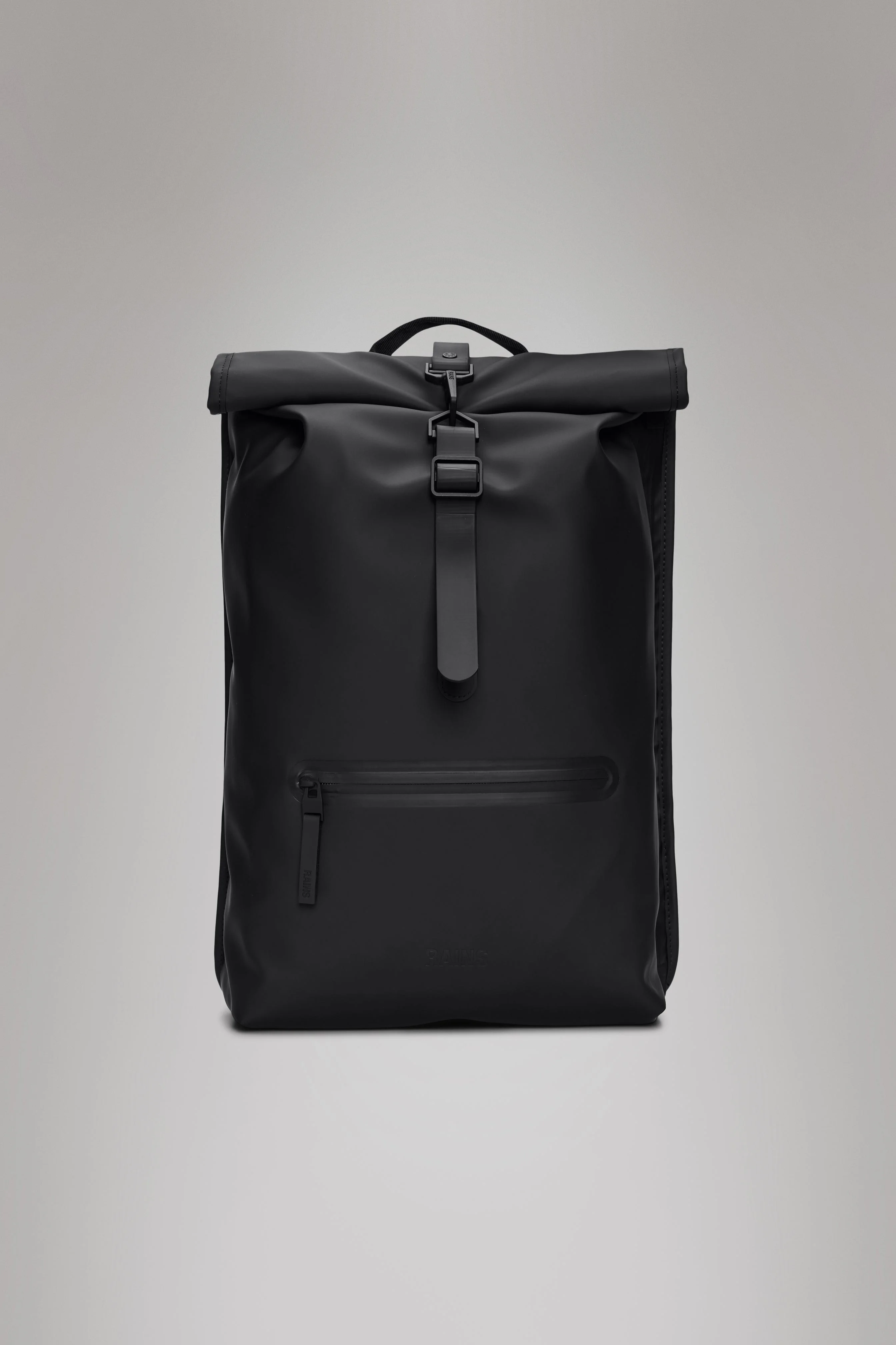 Rolltop Rucksack is a dependable city staple that's perfect for commutes on bike or foot. Characterized by a rolltop opening and cycle-ready features. Rolltop Rucksack is carefully designed to keep precipitation out when traveling from point A to Z. To protect essentials from rain, fold the rolltop into a tight scroll and secure using the signature carabiner. Open the rucksack to reveal a single main compartment. Exterior features include a side-access laptop pocket and a front pocket with coated zipper. Cycle-ready features include a front D-ring -- ideal for holding bike locks -- and a buckle-fastened chest strap for a secure ride-proof fit. Rolltop Rucksack is cut from Rains' signature PU fabric, engineered for carrying strength, durability and a smooth feel. SKU: 13320\01 Details Volume (liter): 4.5 gal Composition: 100.00% PES (Polyester) Water column: 8000 mm Weight: 29.6 oz Features - Waterproof signature PU fabric - Rolltop opening with snap compression and carabiner closure - Single main compartment - Front pocket with coated zip - Side-access slip pocket fits 16" laptop - Padded air-mesh back panel - Adjustable padded shoulder straps - Webbing carry handle - Adjustable chest strap