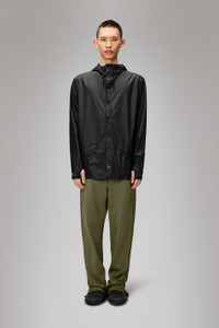 Jacket is an ever-contemporary unisex rain jacket. Characterized by a minimal silhouette with high functionality. This rain jacket features a placket with snap fastenings for closure, hood with built-in cap and two side pockets with snaps. Sleeves are finished with snaps making them adjustable for a loose or tight fit. The design is easy-to-wear with an elegant drape. The unisex rain jacket is completed with under-arm eyelets and a back yoke with concealed vents for breathable comfort. Jacket is cut from Rains' signature PU fabric and features welded seams. The finish is lightweight with a smooth feel. SKU: 12010\01 Details Composition: 100.00% PES (Polyester) Water column: 5000 mm Windproof: Protection against windchill Weight: 16.6 oz Features - Waterproof signature PU fabric - Hood with built-in cap and drawstring - Placket with snap closure - Two side pockets with snaps - snap adjustment at sleeve cuffs - Vents at arm holes and back yoke - Welded seams - Fishtail hem - Regular fit